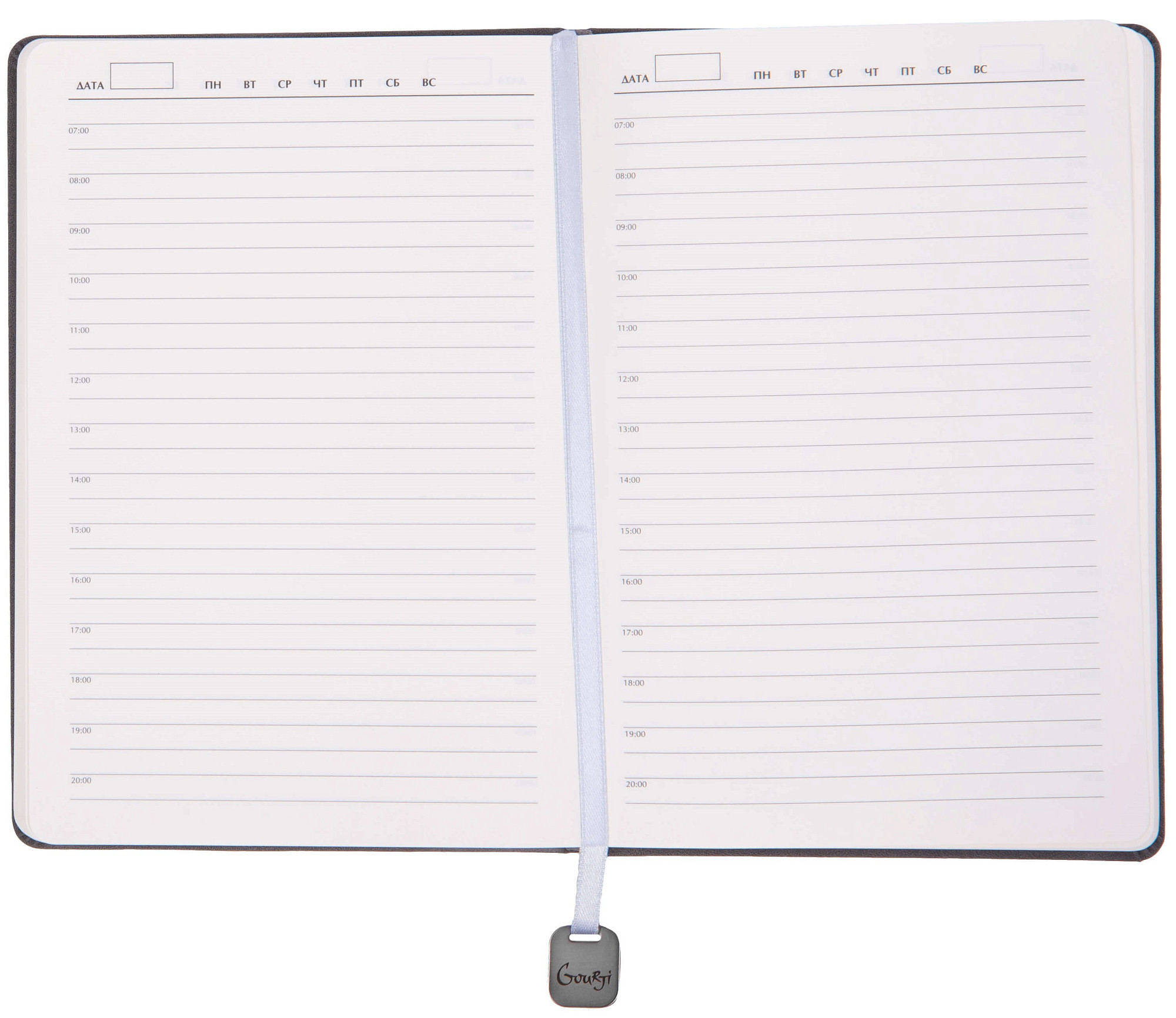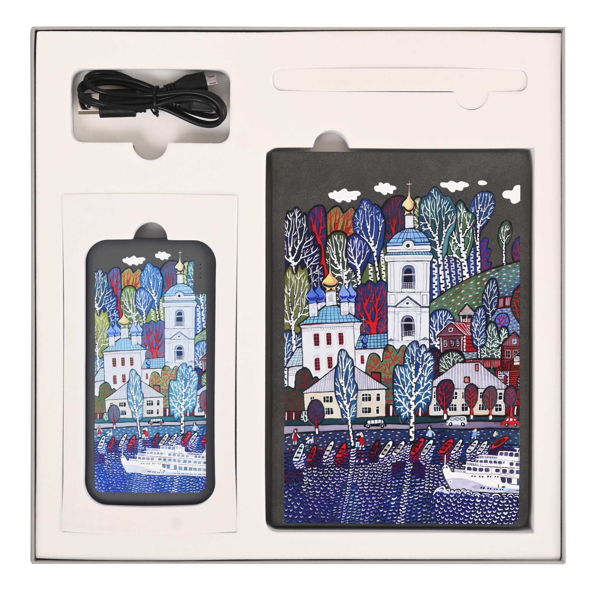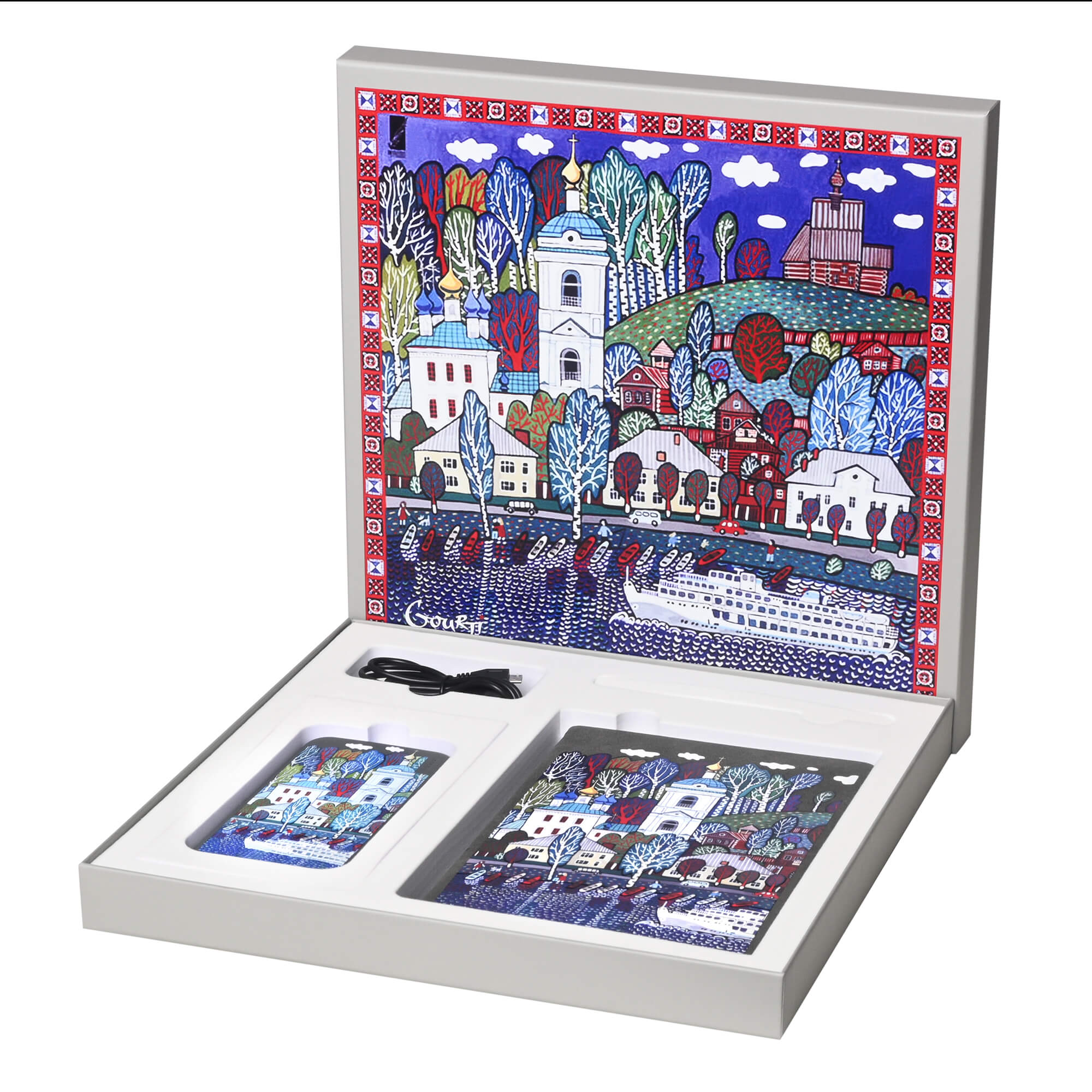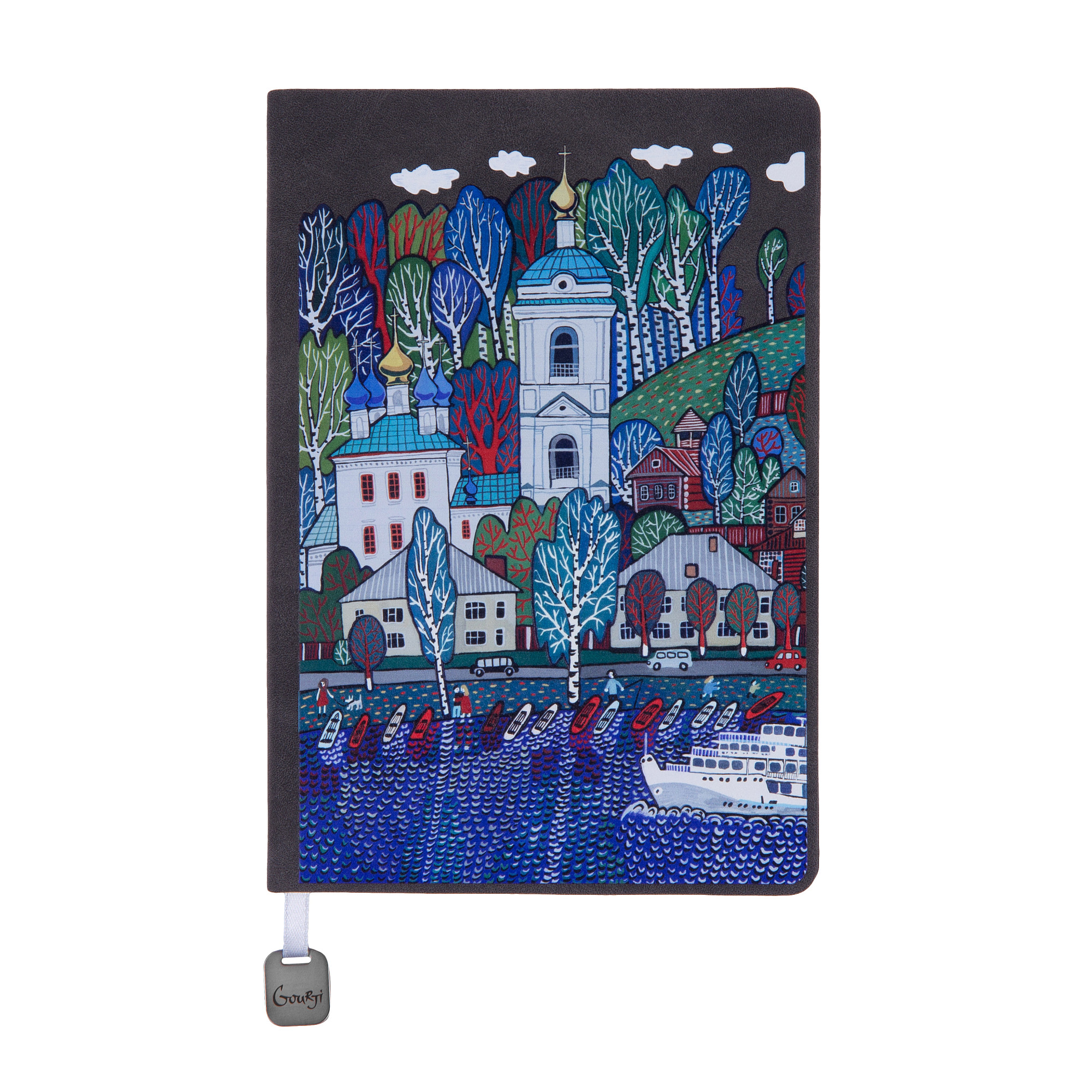 На ежедневнике «Плес» художница в своей авторской манере изобразила панораму города и вид с Волги на церковь Святой Варвары с ее голубыми и золотыми куполами и на гору Левитана, где расположена деревянная Воскресенская церковь.