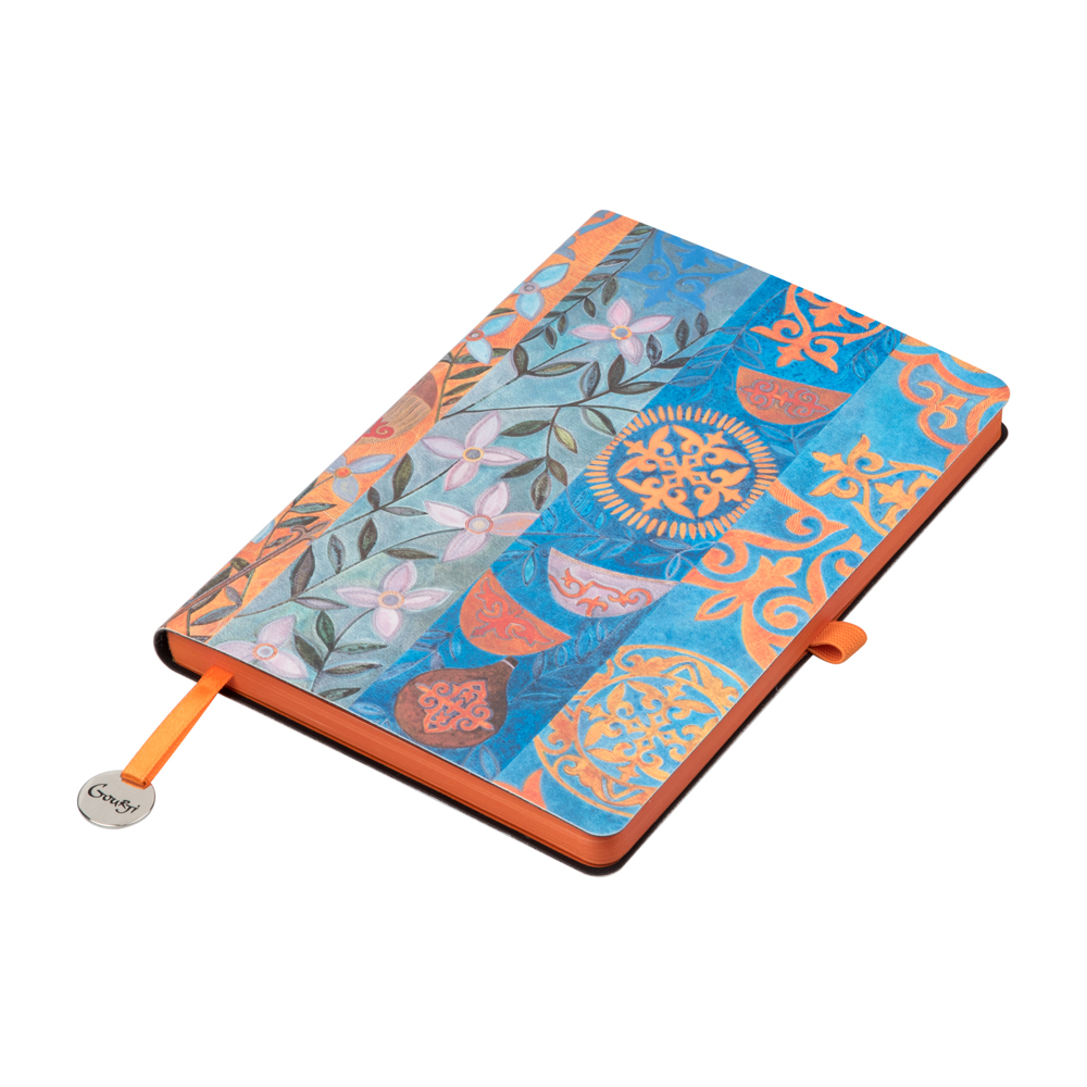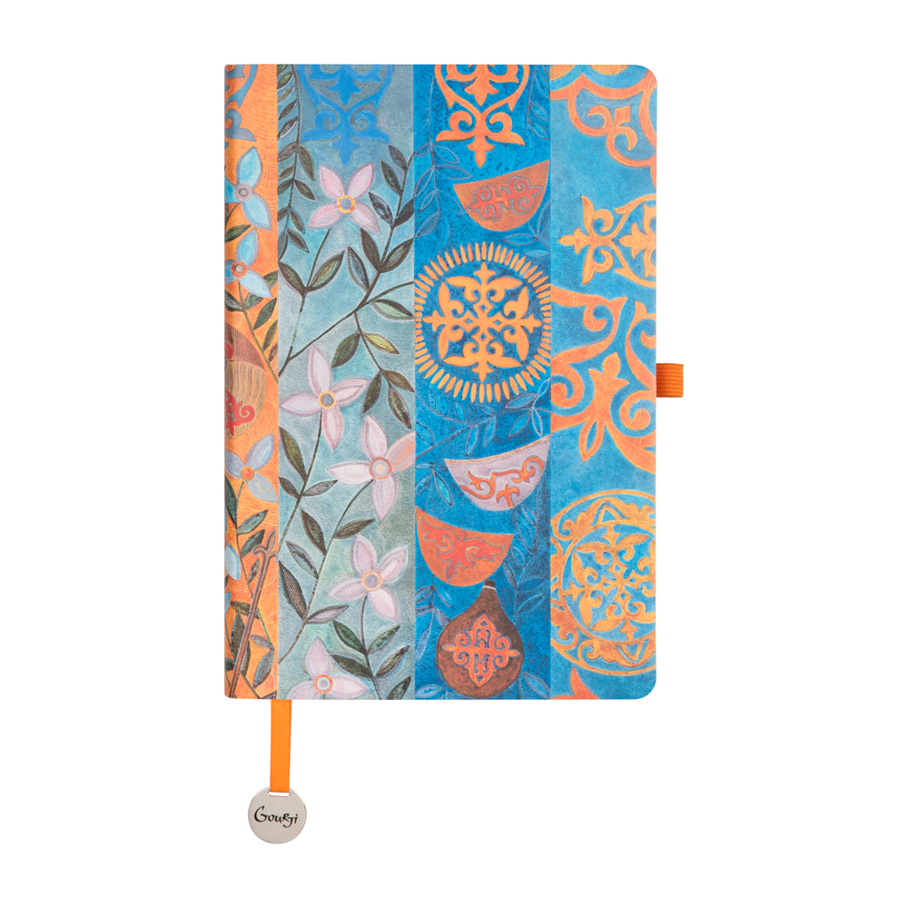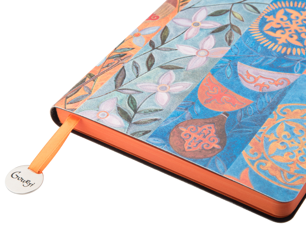 Обложка выполнена из качественной экокожи, отмечать нужный разворот поможет закладка в виде оранжевой ленты с серебристой «медалькой» Gourji.