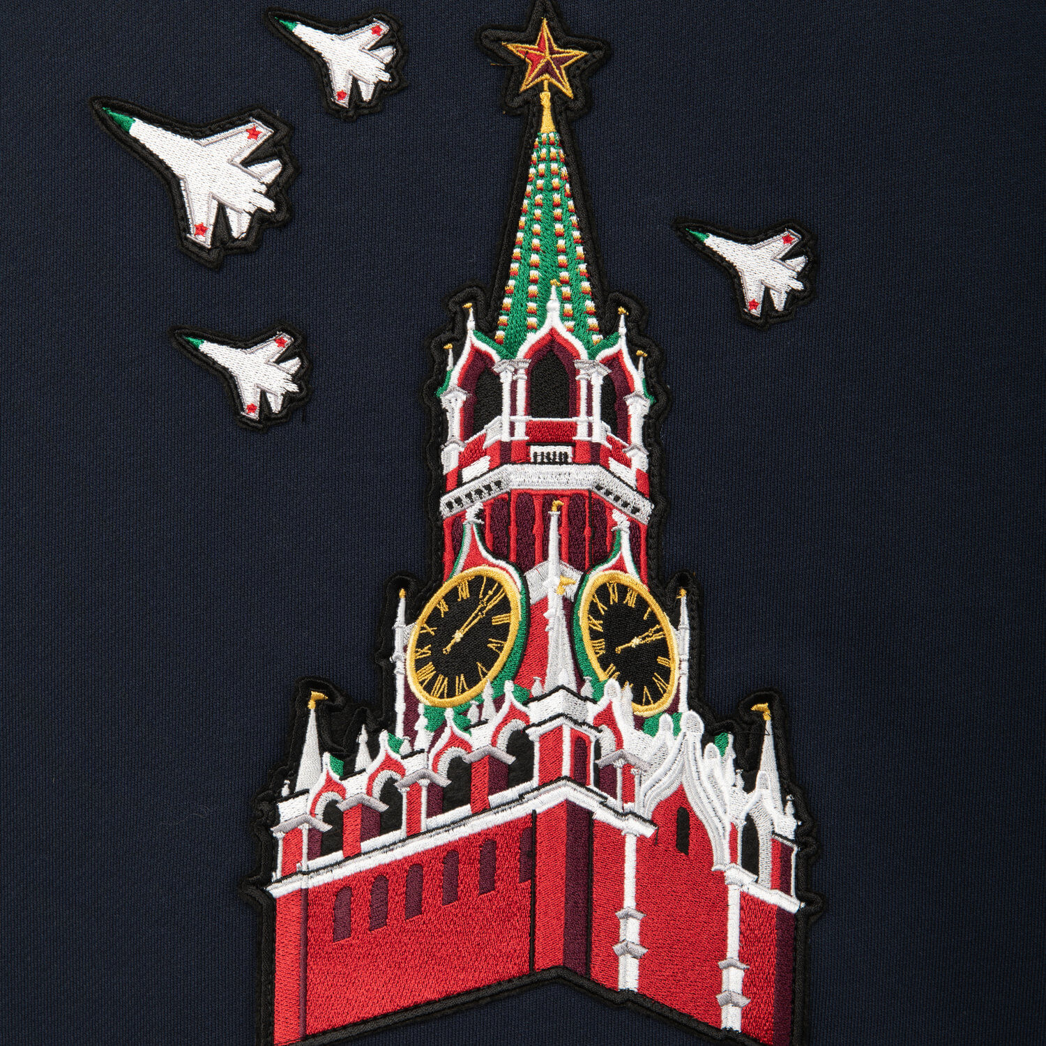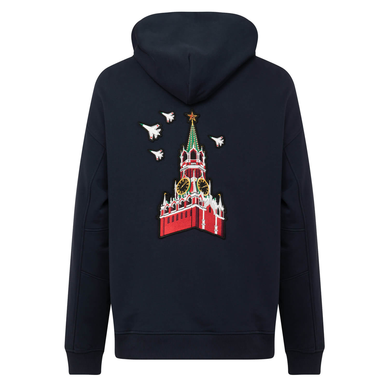 На спине — Кремлевская башня во всей красе своих ярких цветов, а над ней — четыре белоснежных самолёта.