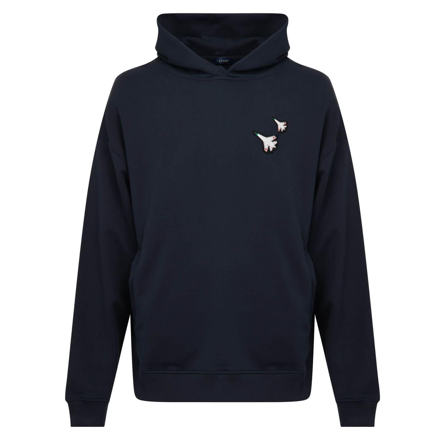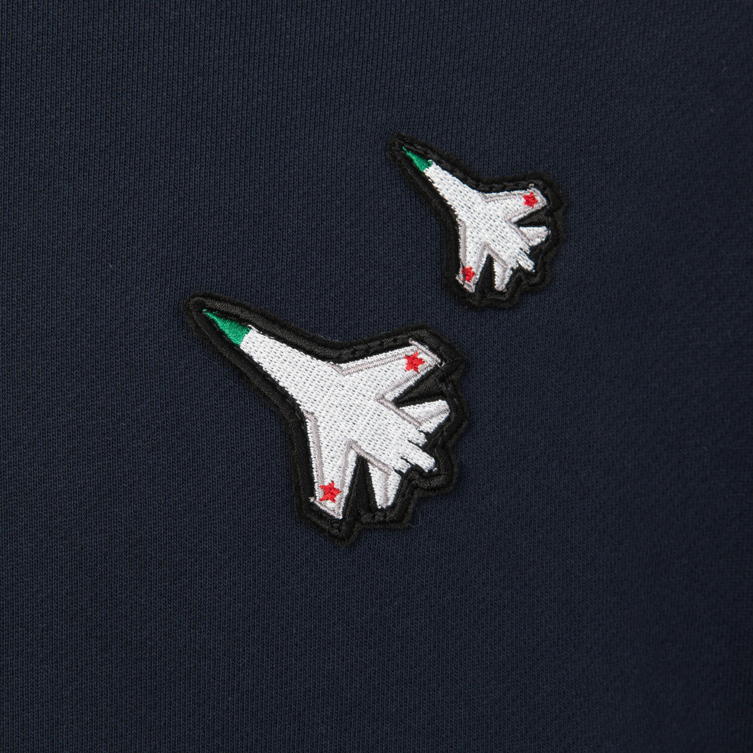 На груди — рифма из двух истребителей, поменьше и побольше.