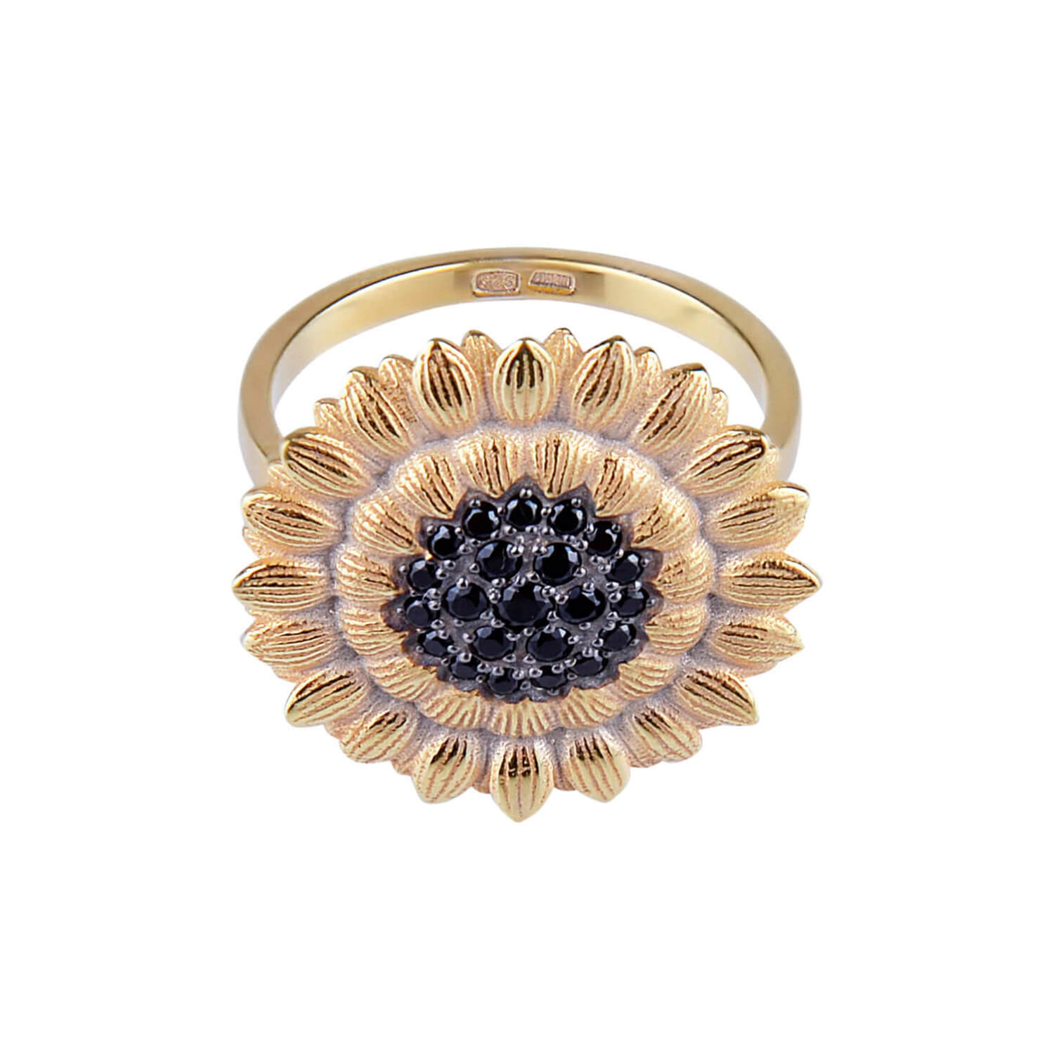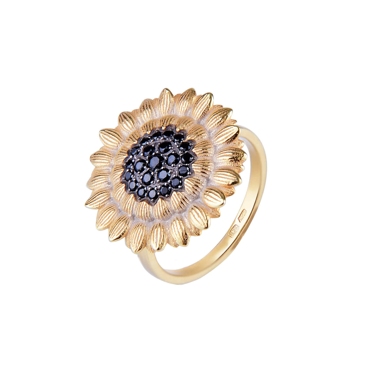 Серьги и кольца серии «Подсолнухи» изготовлены из серебра с позолотой, их сердцевины украшены паве из белых топазов.
