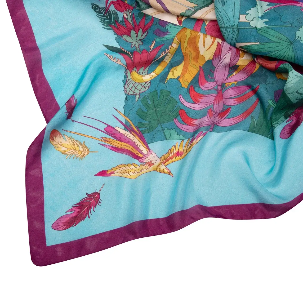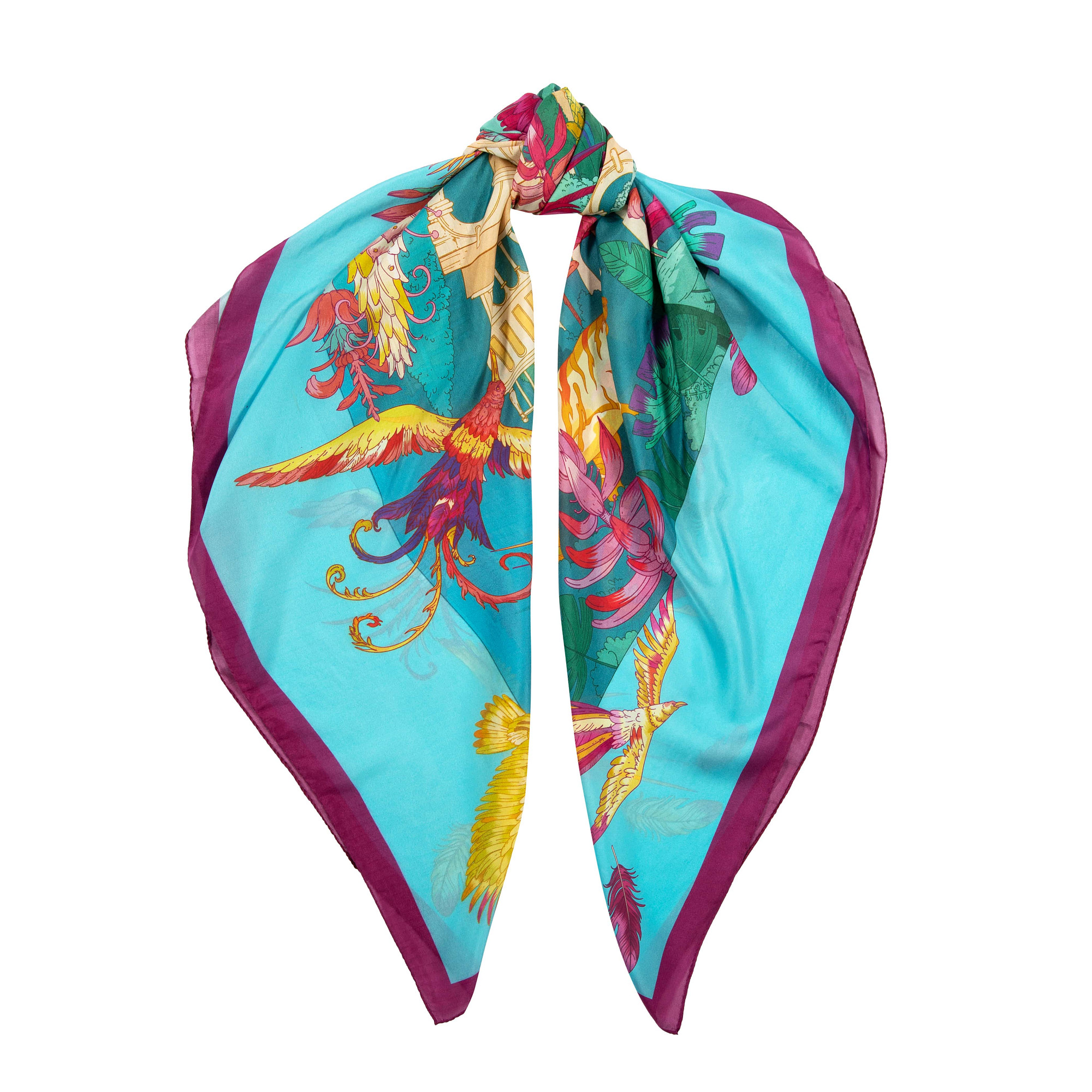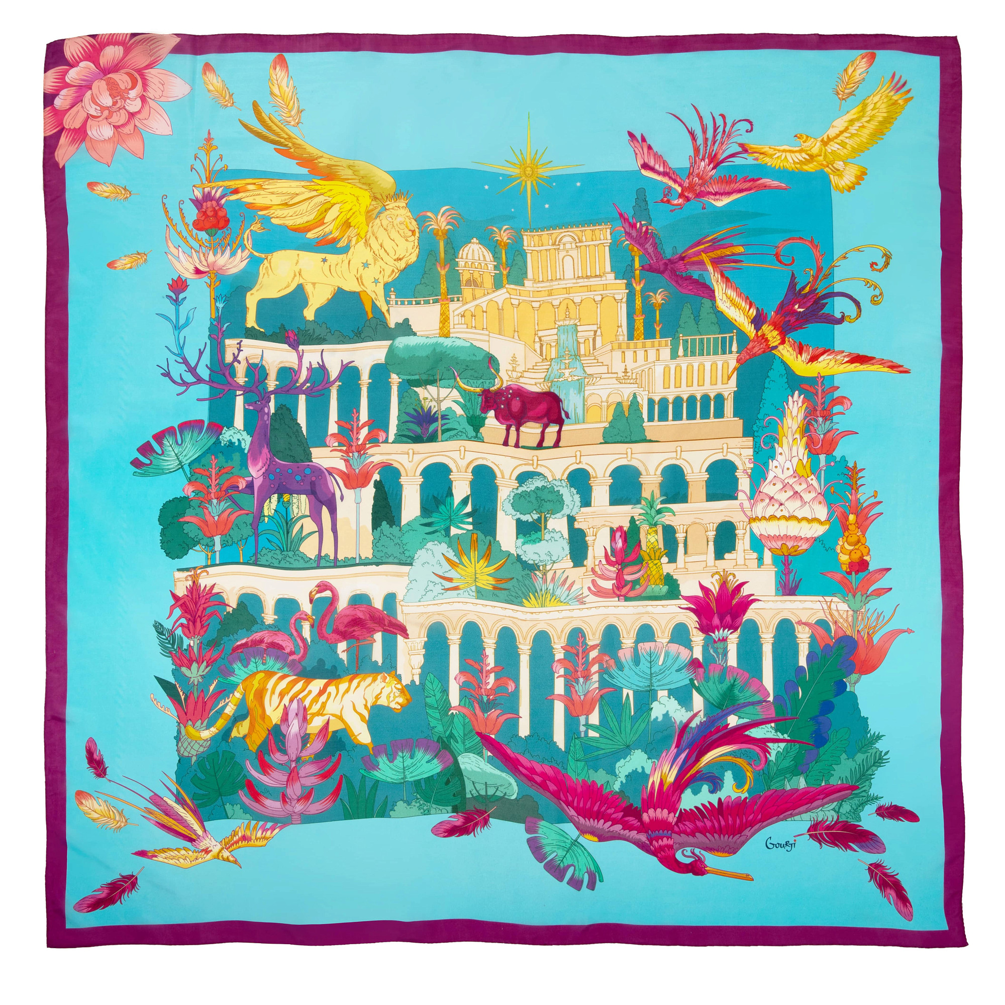 На платке Gourji «Дивный сад» из шелка по эскизу Марины Рудько запечатлены фантазии художника о садах легендарного Города: стройные колоннады из золотистого камня, каскады фонтанов, пинии и пальмы, прекрасные цветы и удивительные животные.