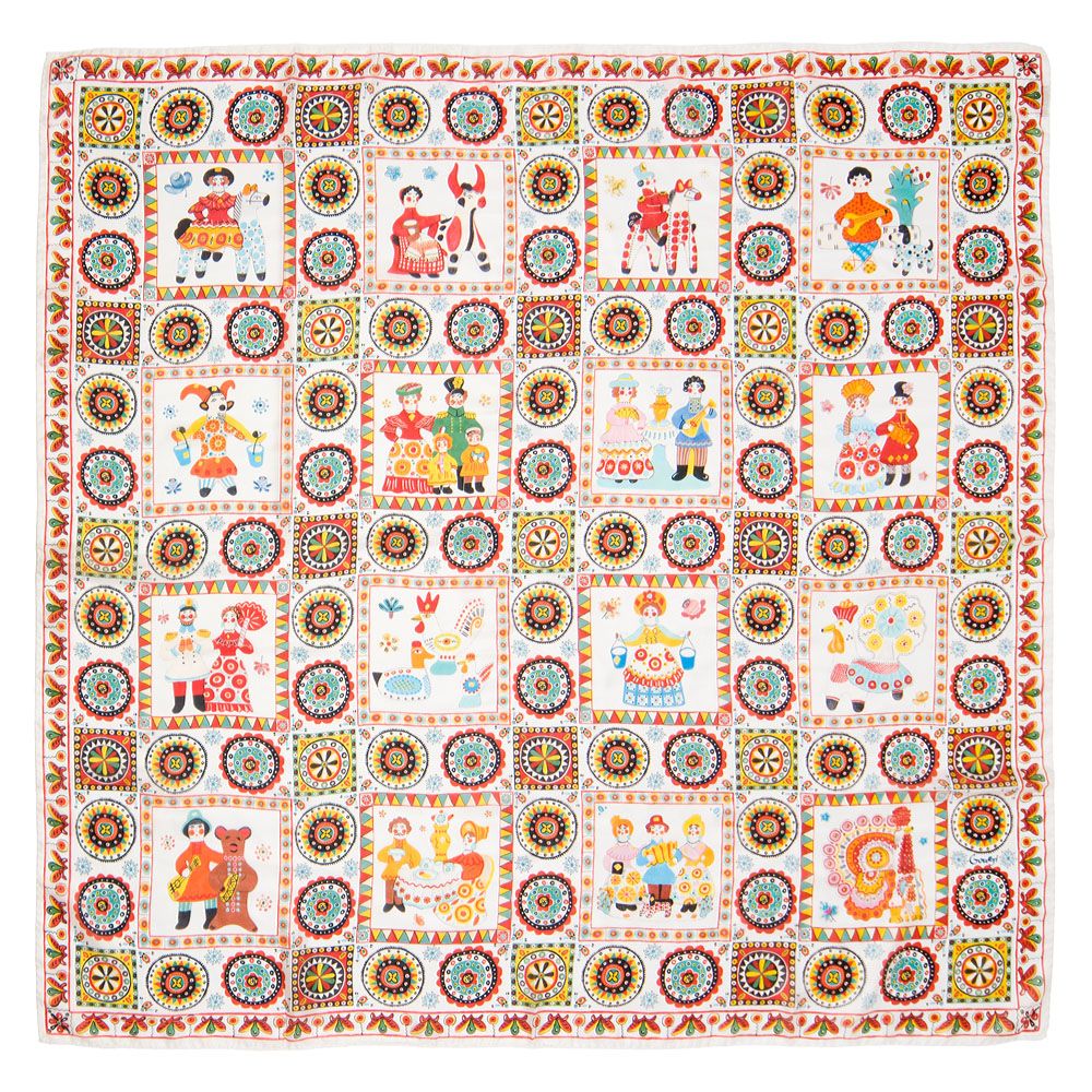 Шестнадцать милых фигурок и фигурных композиций, вписанных в пространство этого платка (автор – Софья Уткина), представляют собой целую галерею лучших образцов русских расписных глиняных игрушек.