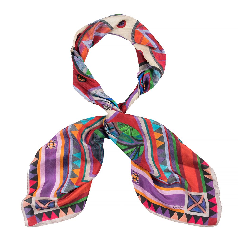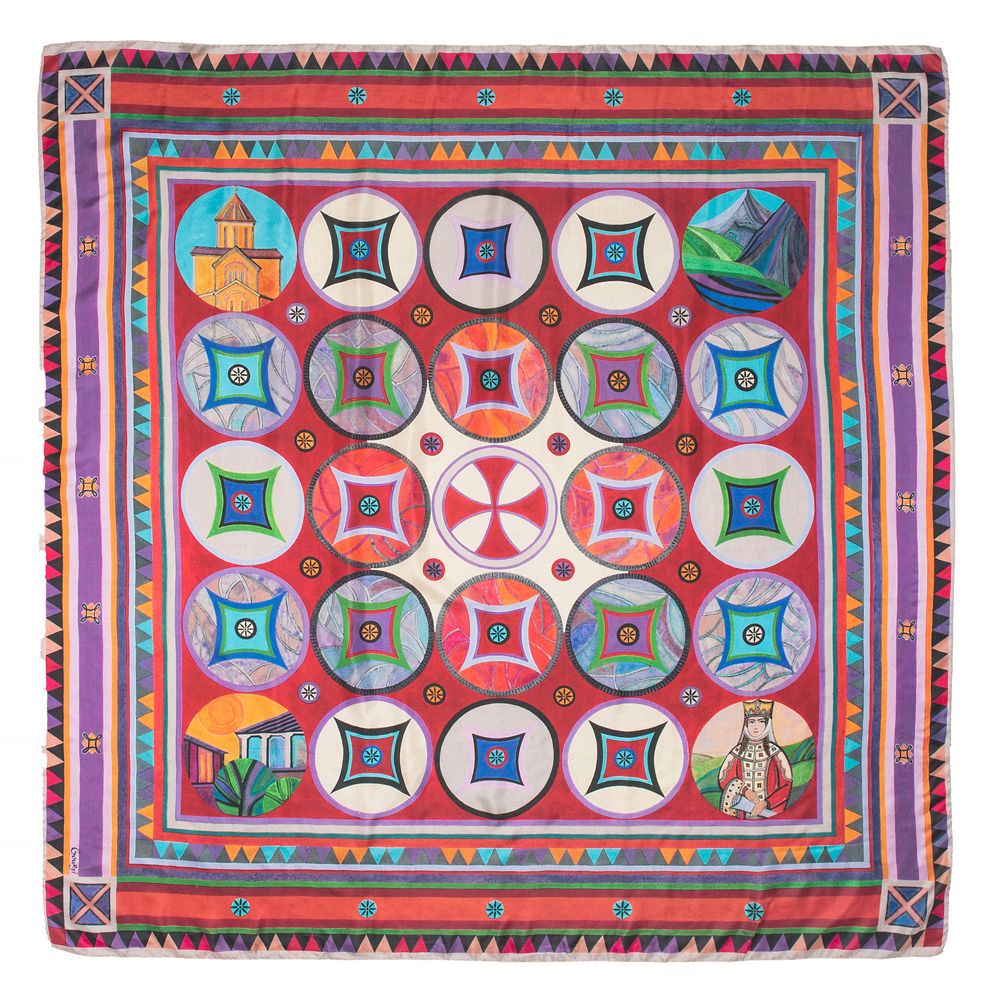 Художница Марина Усачева использовала в работе над платком традиционные хевсурские орнаменты и знаковые для грузинской культуры образы и темы.