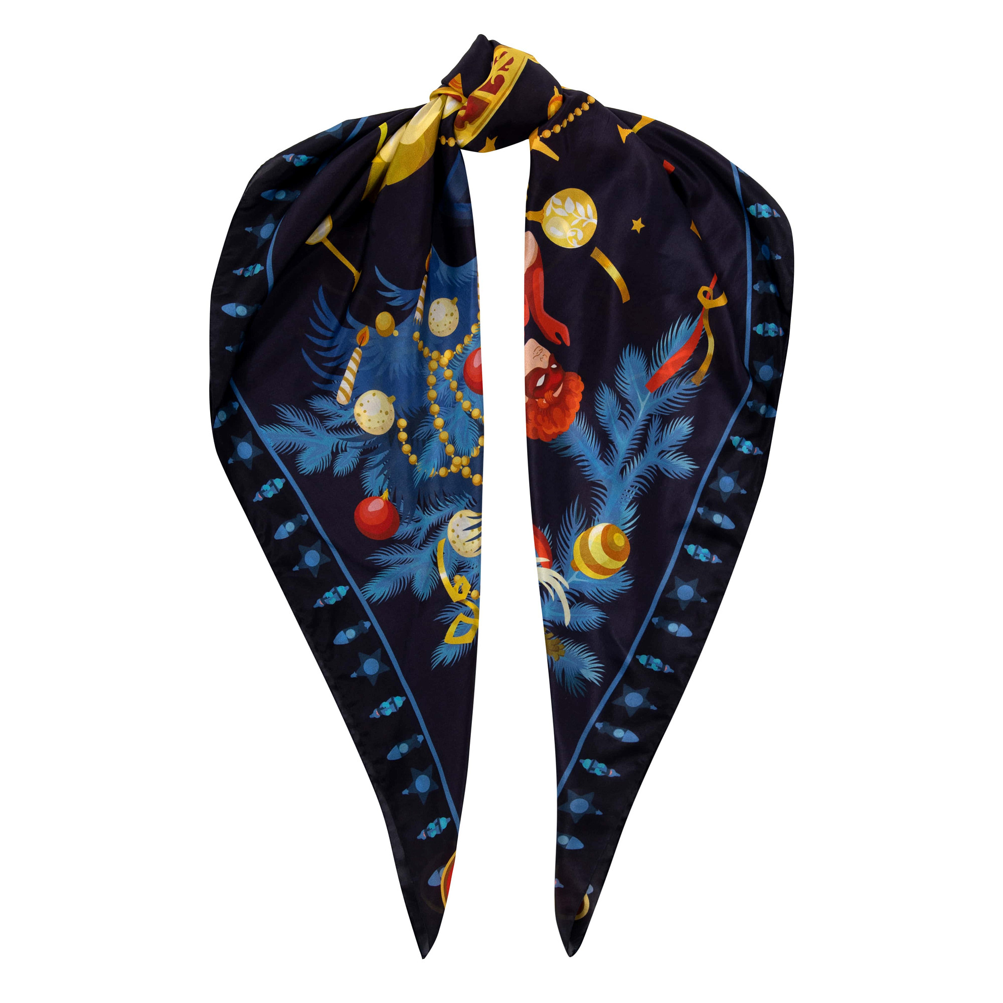 Красная пятиконечная звезда — елочная, но похожая на кремлевскую — в композиционном центре платка напоминает о бое кремлевских курантов в полночь 31 декабря, возвещающем наступление Нового года.