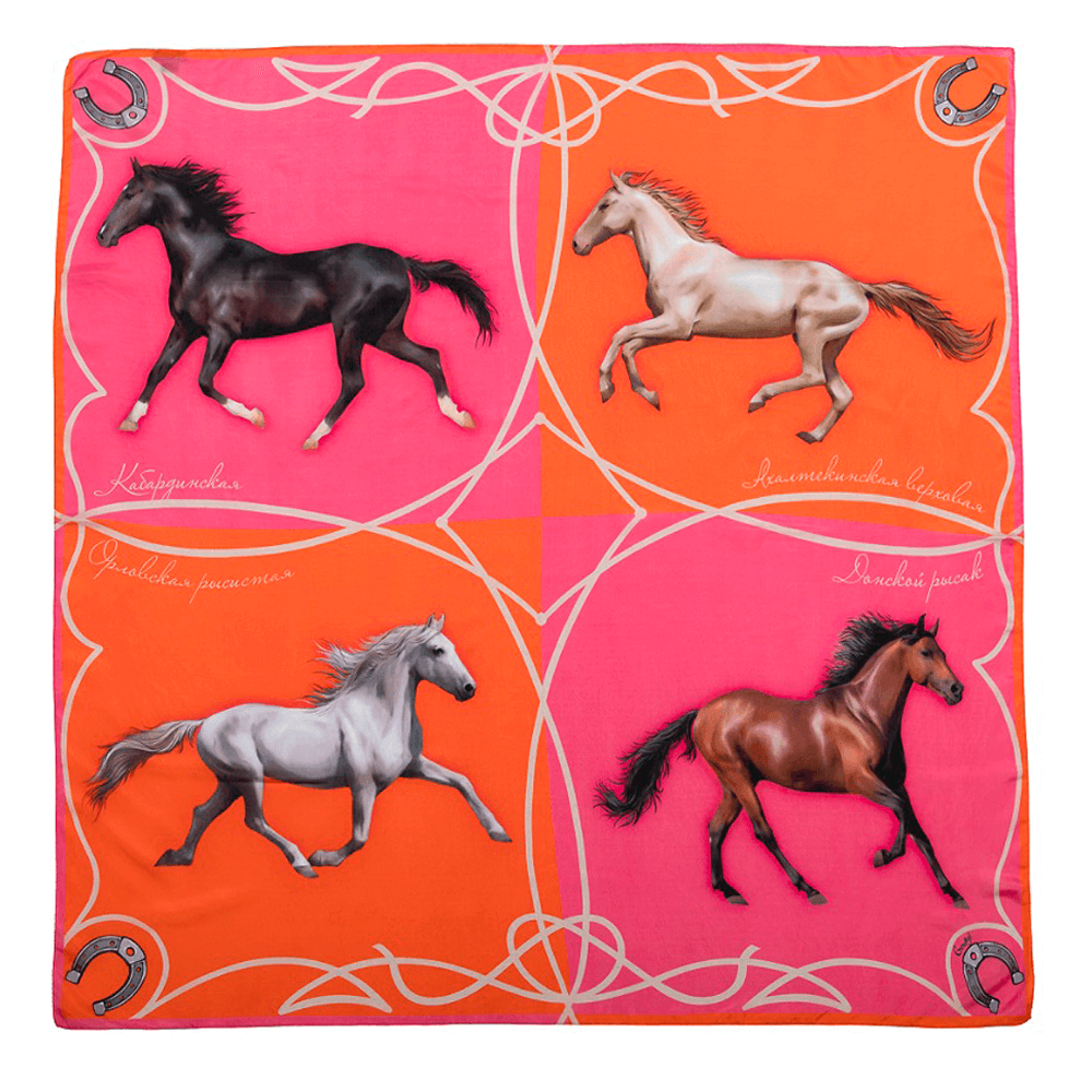 Квадрат платка разделен на четыре равные части, каждая из которых стала «рамой» для реалистического изображения одной из четырех пород лошадей, выведенных на территории современной России.