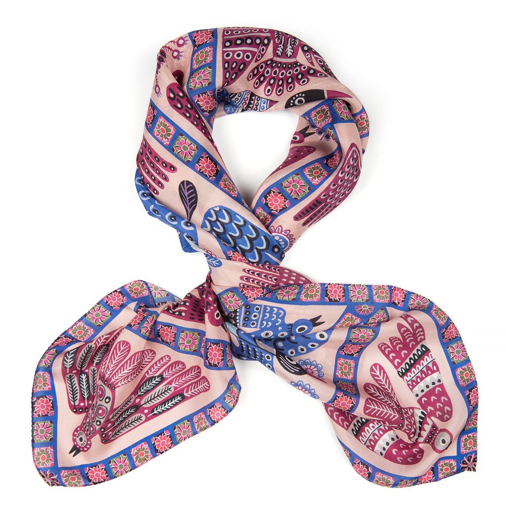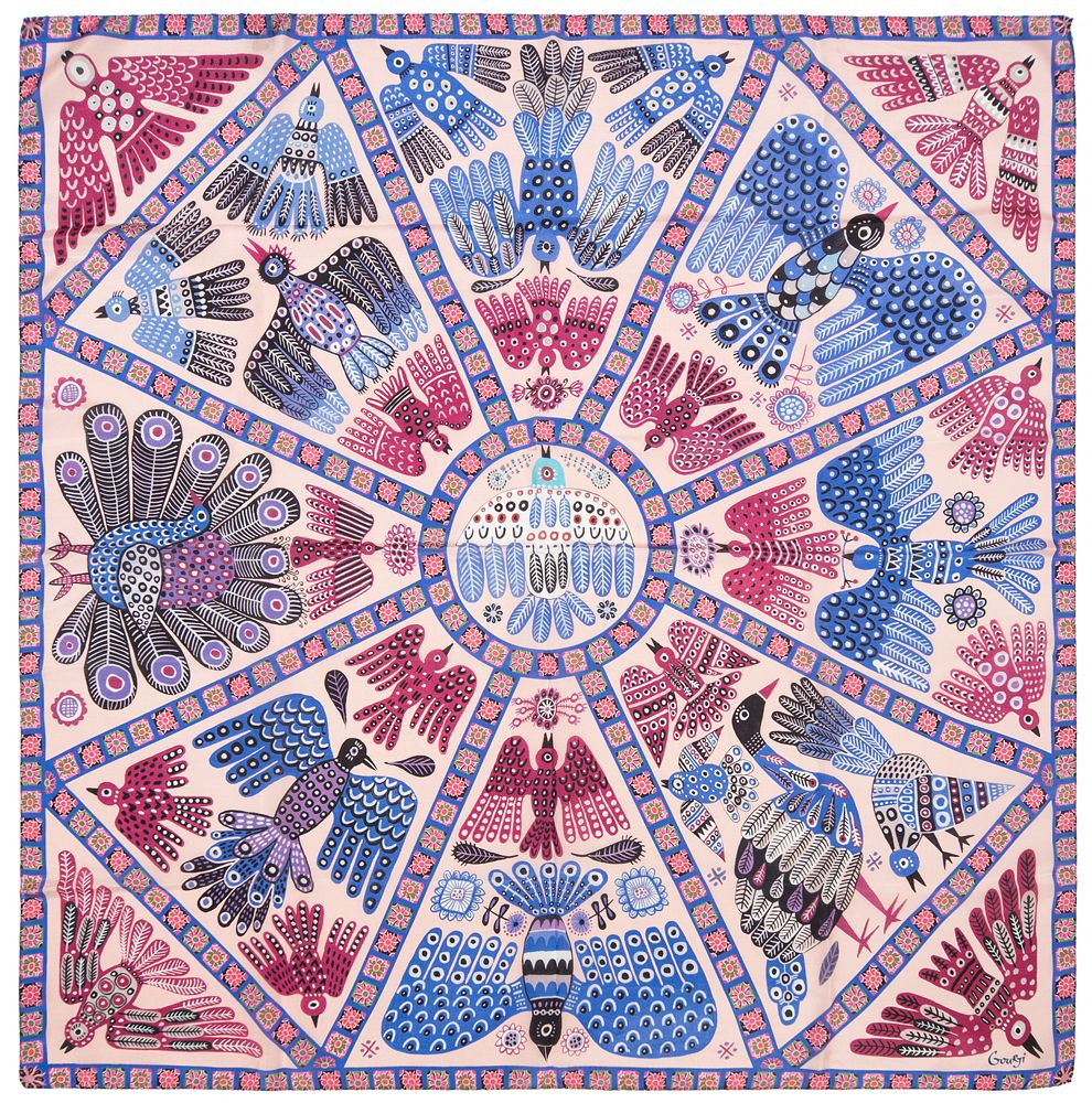 И в центральный круг, и в окружающие его восемь клиньев, и в четыре треугольника по углам платка – в каждый из этих элементов вписаны раскинувшие крылья птицы с ярким опереньем, словно парящие в небесах; по клиньям и по краям шали пущен абстрактный декоративный орнамент.