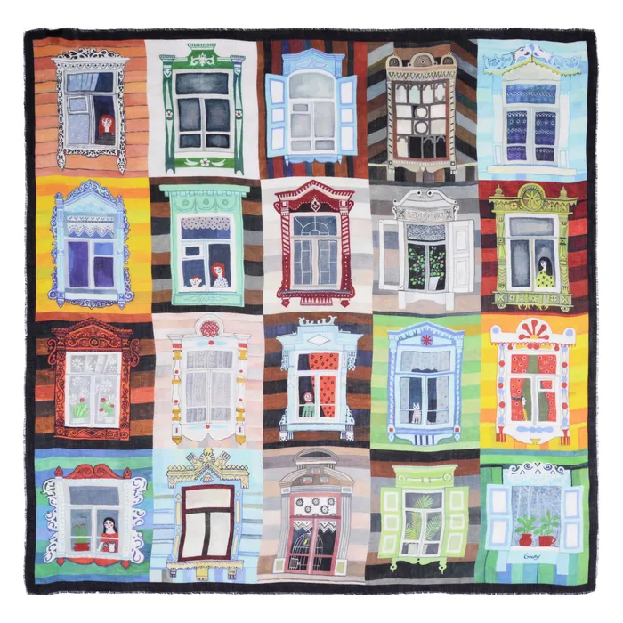 Двадцать окон разных форм и конфигураций с потрясающей красоты наличниками – вот основной сюжет платка «Окна».