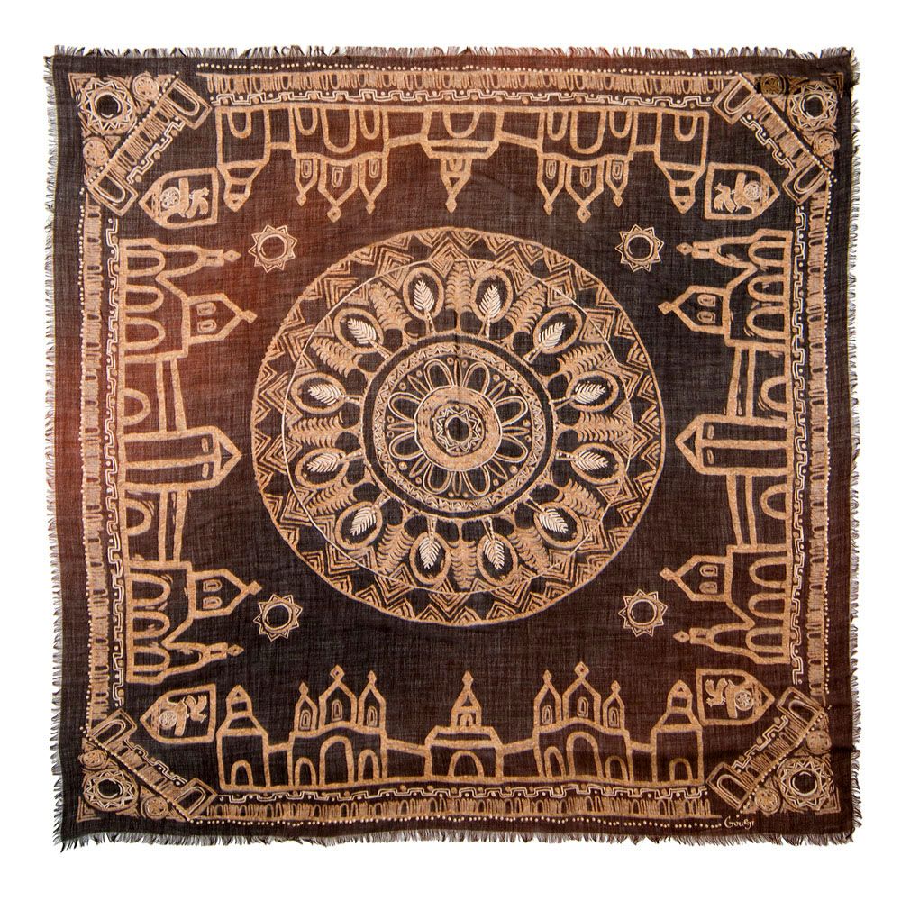 Эти квадратные платки, выполненные по мотивам русских льняных текстильных изделий, – своеобразное напоминание о традиционных народных узорах и фольклорных орнаментах в вышивке и ткачестве.