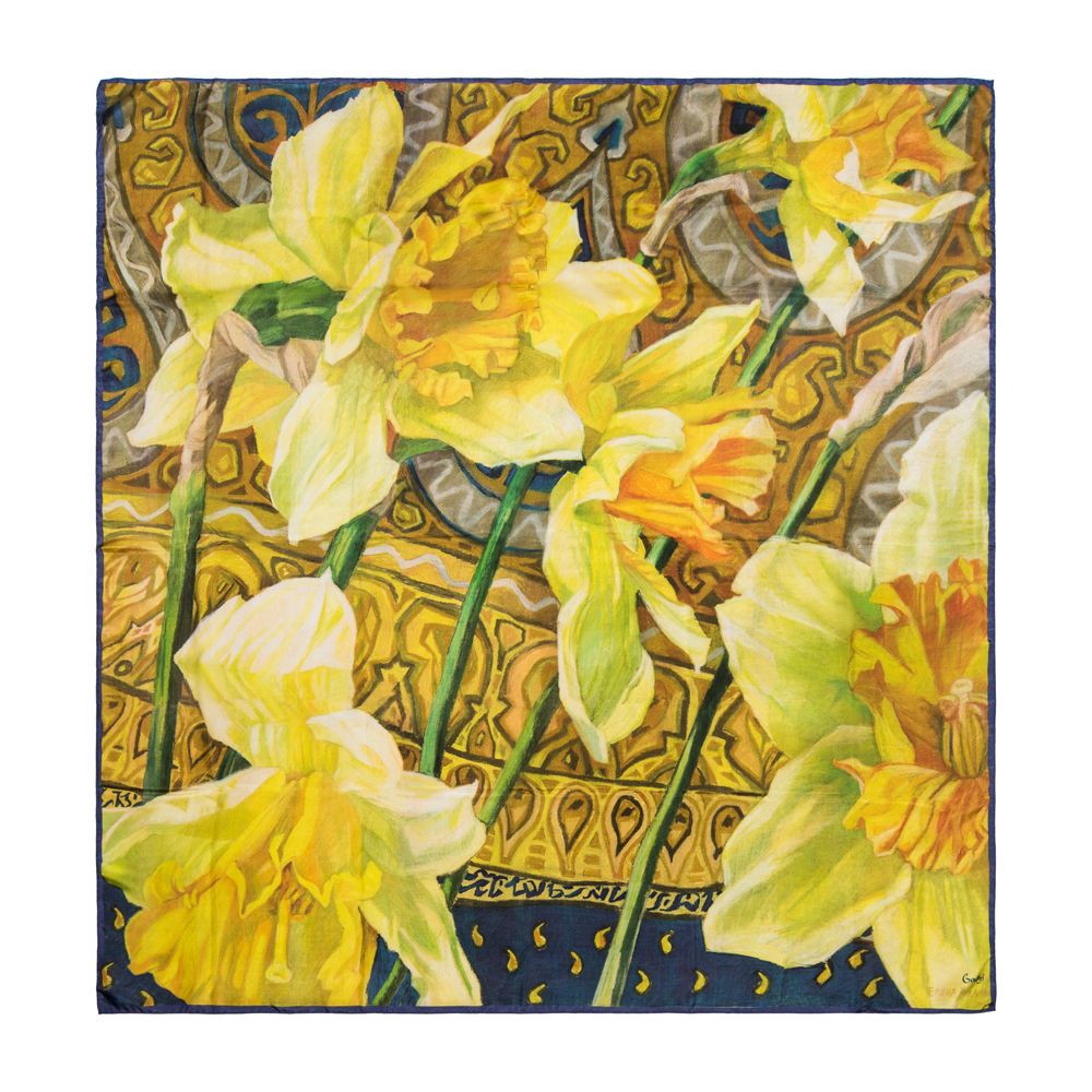 Желтые нарциссы с зелеными стеблями на глубоком фиолетово-золотом фоне восточного платка – эта яркая цветовая гамма, а также композиция этой картины на шелке созданы для того, чтобы привлекать внимание.