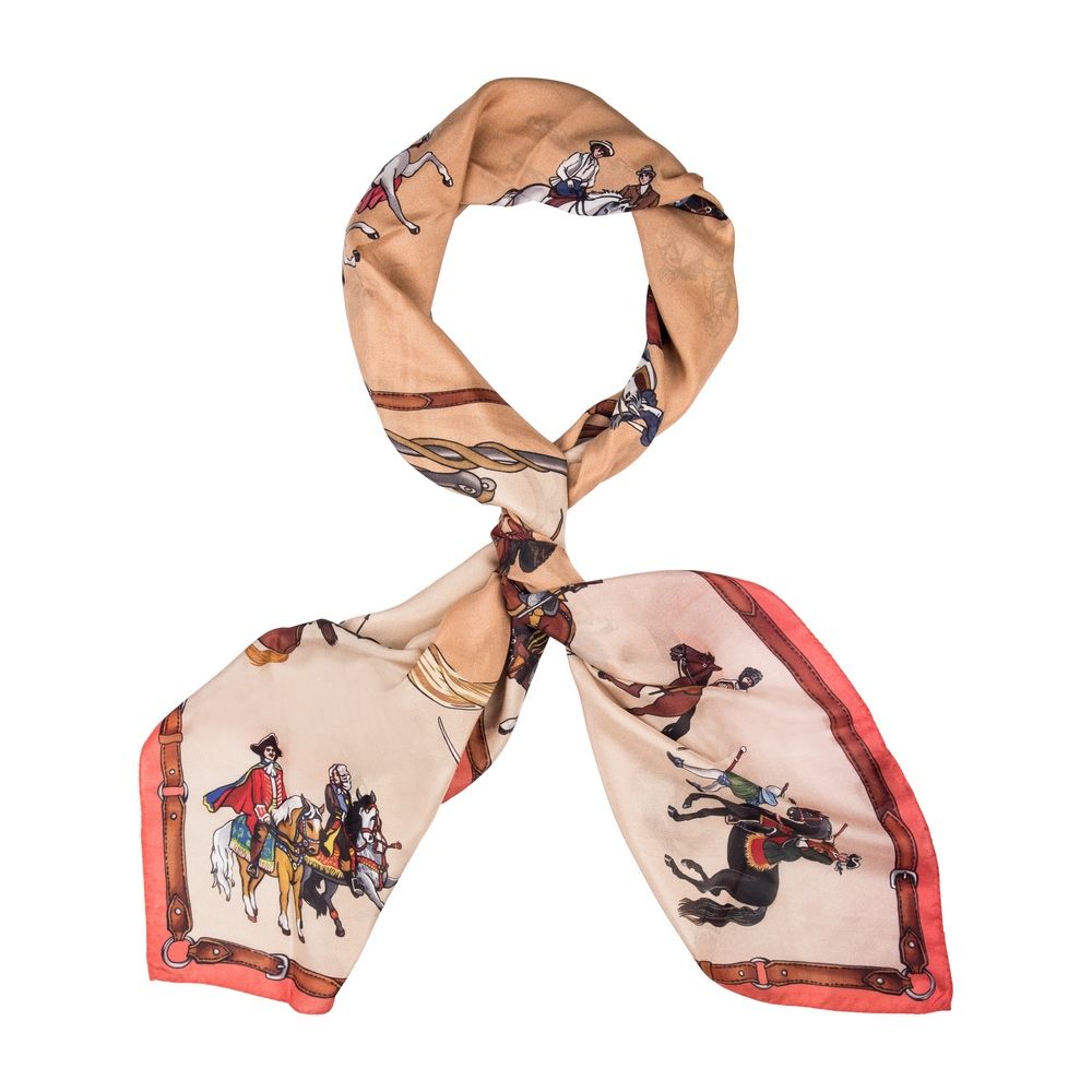 Спокойный бежевый фон шали идеально сочетается с элементами в виде атрибутики для скачек – конской упряжи, уздечек и хлыстов.
