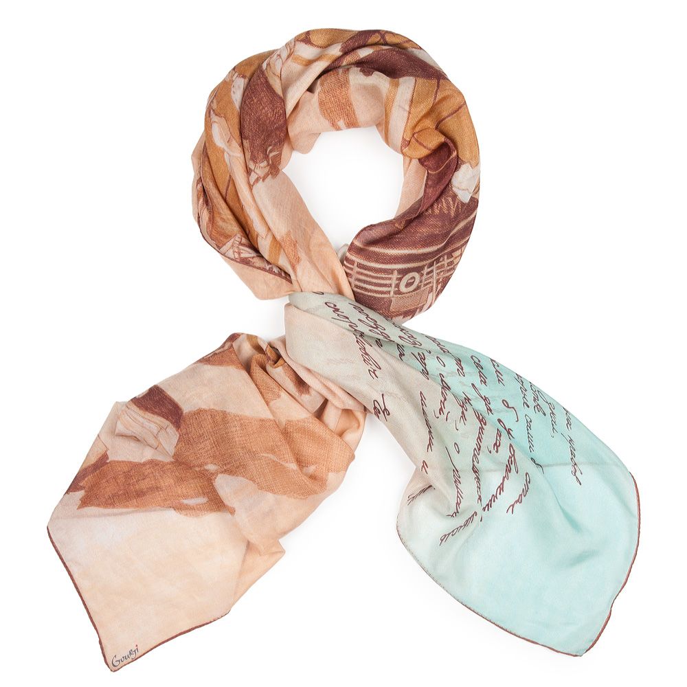 Верх этого шелкого платка украсили написанные художником от руки цитаты из чеховского рассказа «Дама с собачкой».