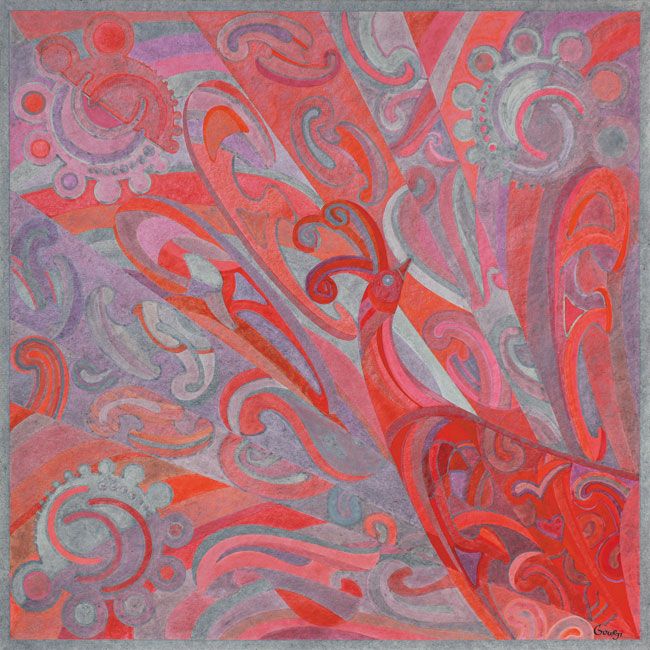 Орнамент, навеянный оперением красавца-павлина, с таким же успехом мог оказаться и на маминой шали, настолько он эффектен; скорее она подойдет девочкам-подросткам, уже успевшим побывать на выставках и в музеях и способных оценить фантазию художника.