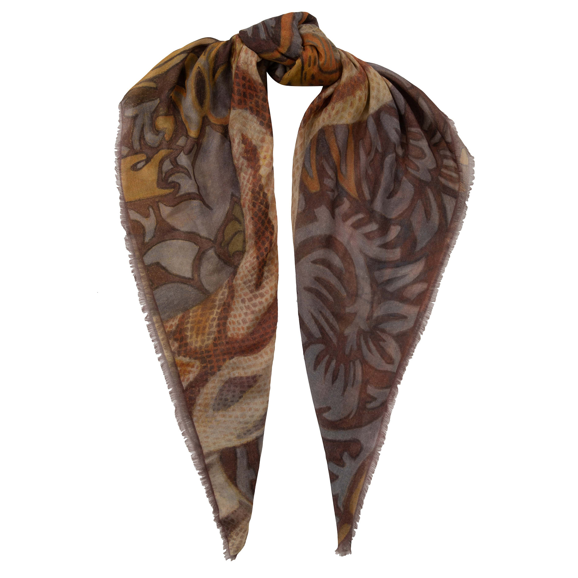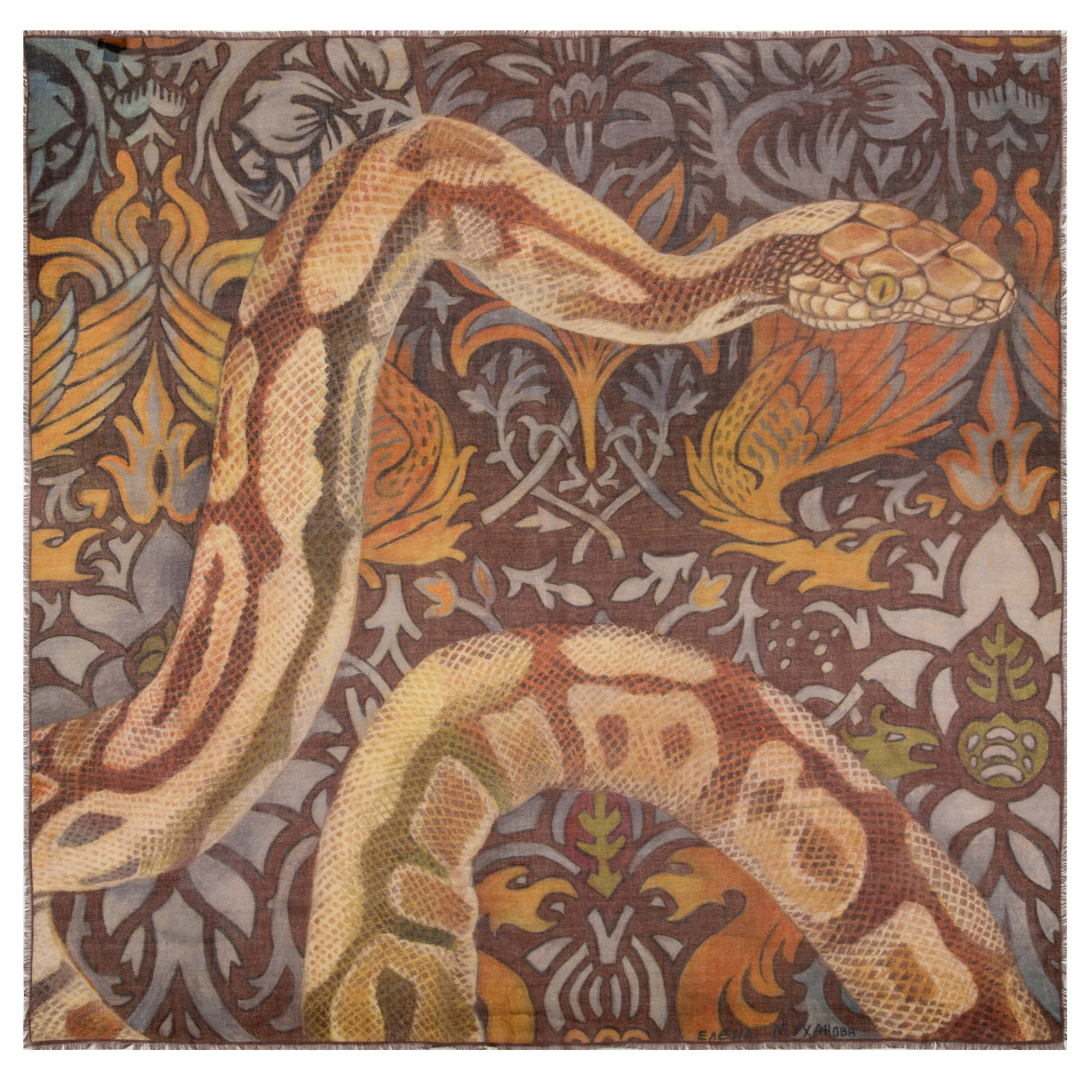 Платок более лаконичен: внимание сконцентрировано на контрасте чешуи питона и фонового орнамента.