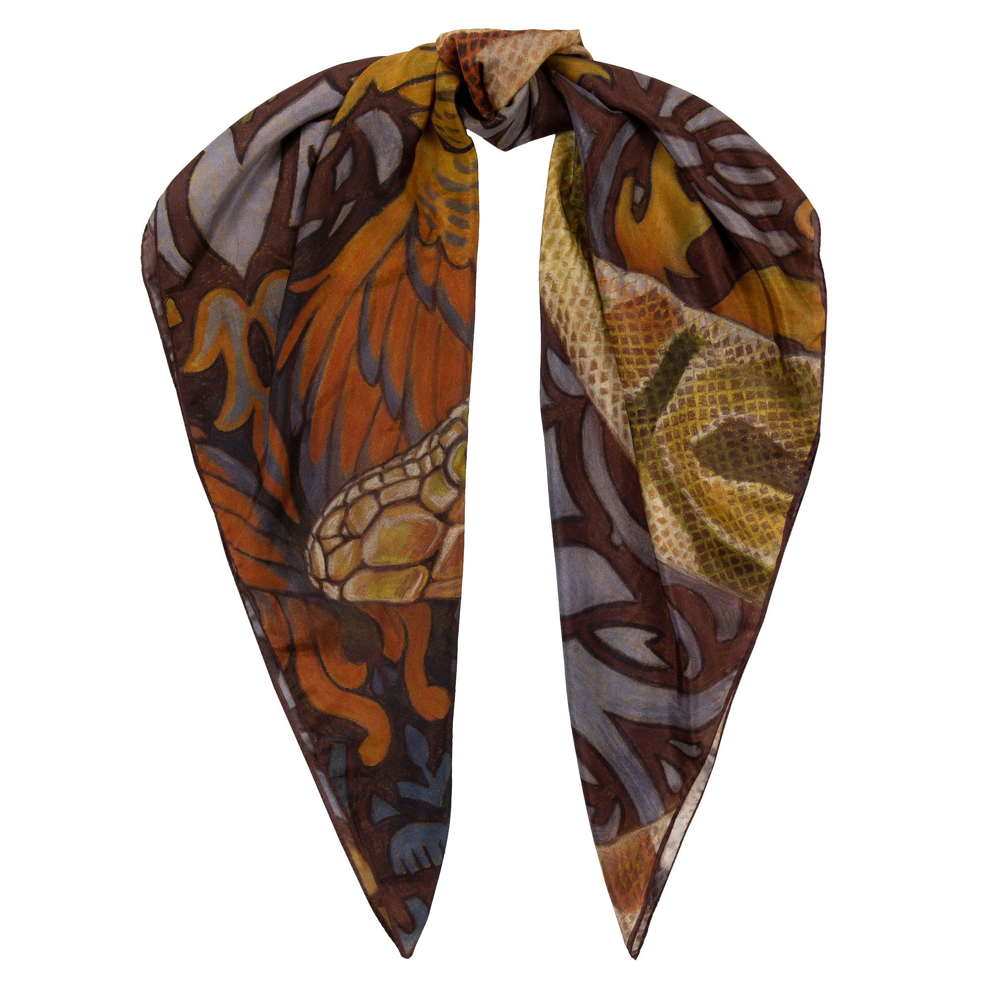 Платок более лаконичен: внимание сконцентрировано на контрасте чешуи питона и фонового орнамента.