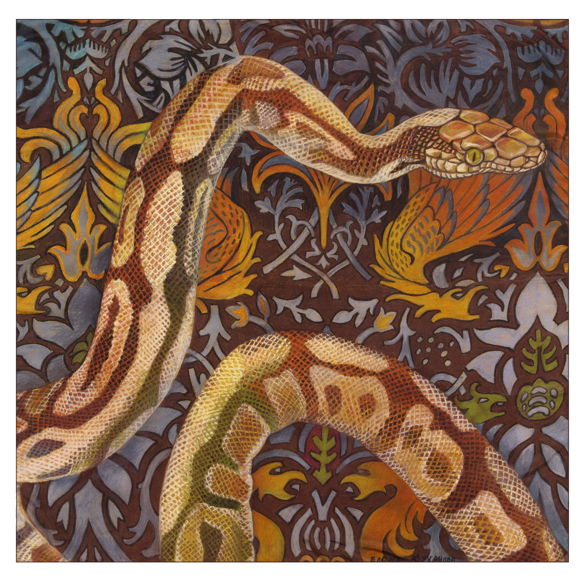 В эскизе платка и шали «Змея» художница сочетала декоративные орнаментальные мотивы в стиле Arts & Crafts и реалистичное, почти натуралистичное изображение змеи — мощного, прекрасного естественной красотой питона с пятнистой шкурой.