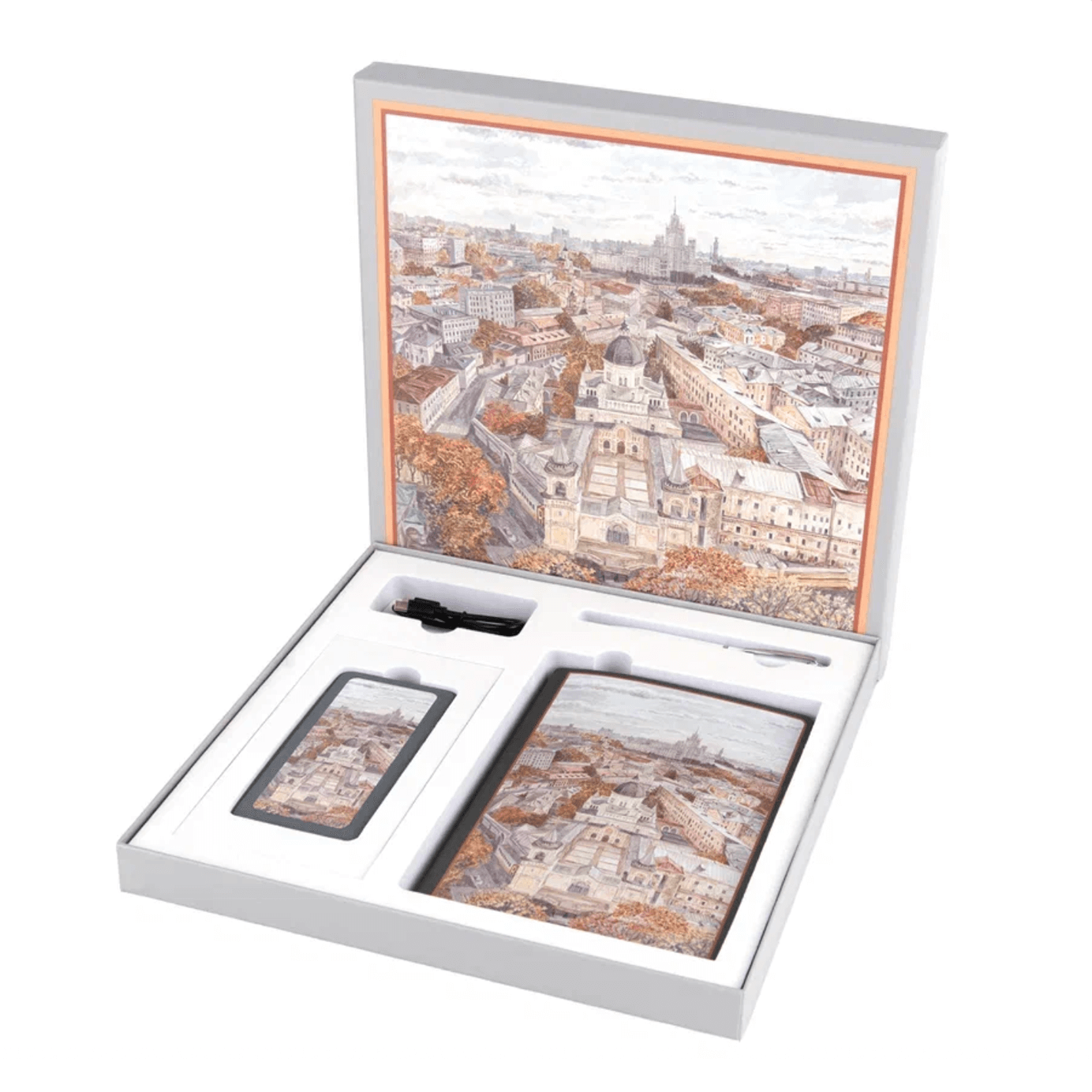 Подарочный набор включает в себя внешний аккумулятор, ежедневник и ручку. Аксессуары аккуратно размещены в стильной брендированной коробке, в которой для каждого предмета предусмотрена специальная ячейка.