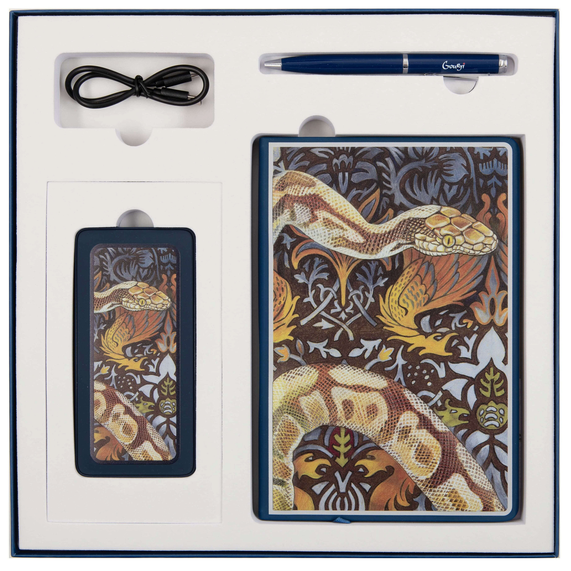 Подарочный набор включает в себя внешний аккумулятор, ежедневник и ручку. Аксессуары аккуратно размещены в стильной брендированной коробке, в которой для каждого предмета предусмотрена специальная ячейка.