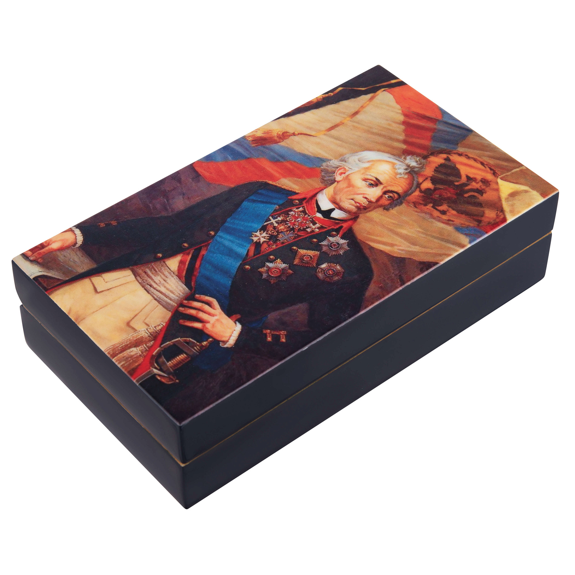 Эту фразу мастера из Холуя бережно воспроизвели на корпусе ручки Gourji, изготовленной из черной акриловой смолы, вместе с портретом Суворова на фоне российского флага — миниатюрой по мотивам знаменитой картины.