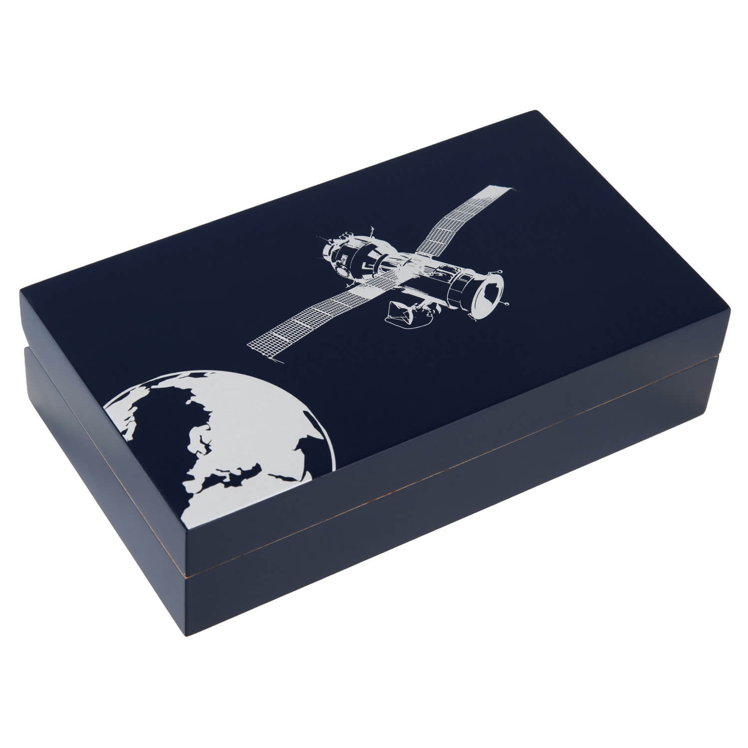 На корпусе темно-синего цвета сияет Млечный путь и сверкают звезды. В его верхней части это бесконечное пространство разрезает первый искусственный спутник Земли, запущенный в СССР в 1957 году.