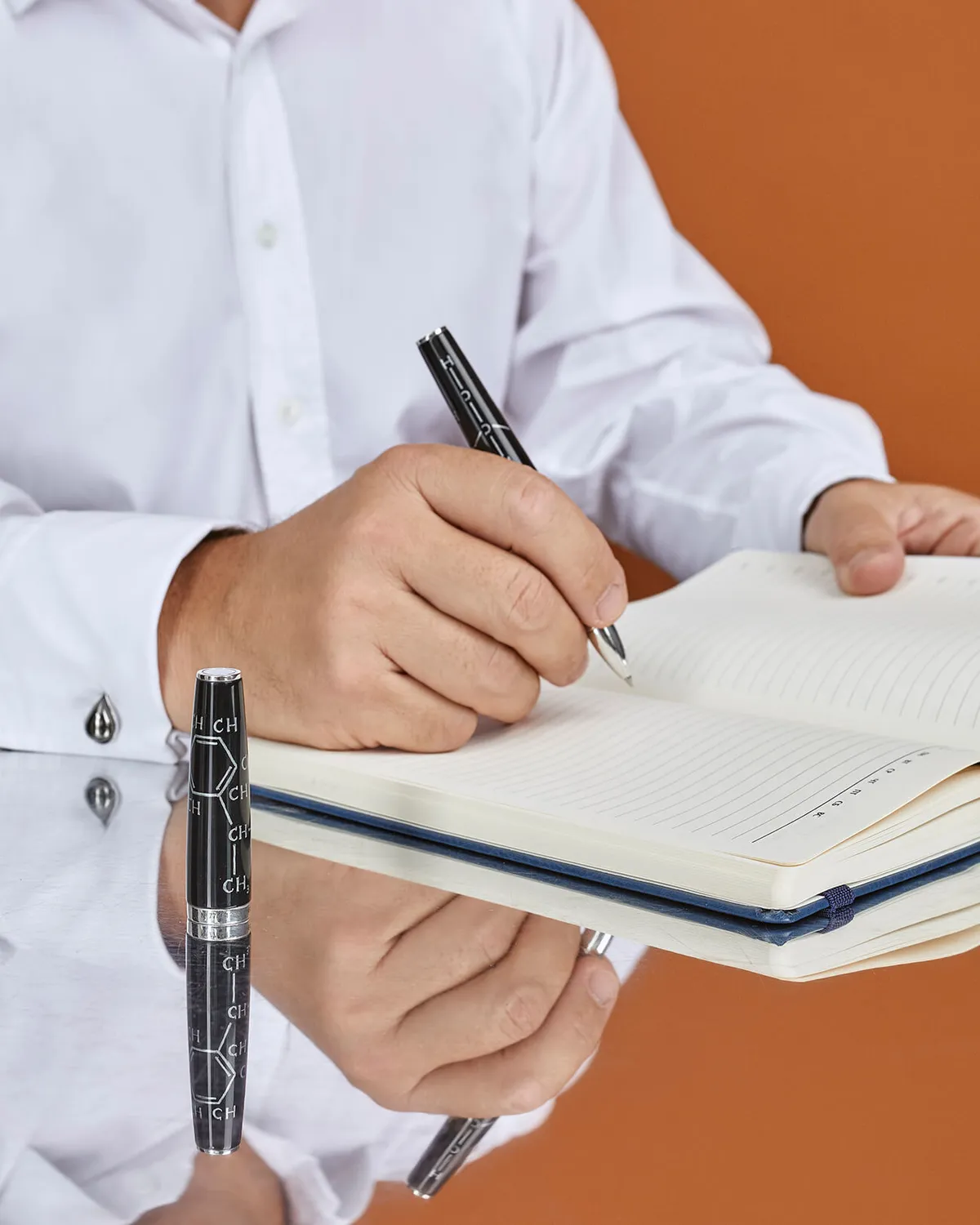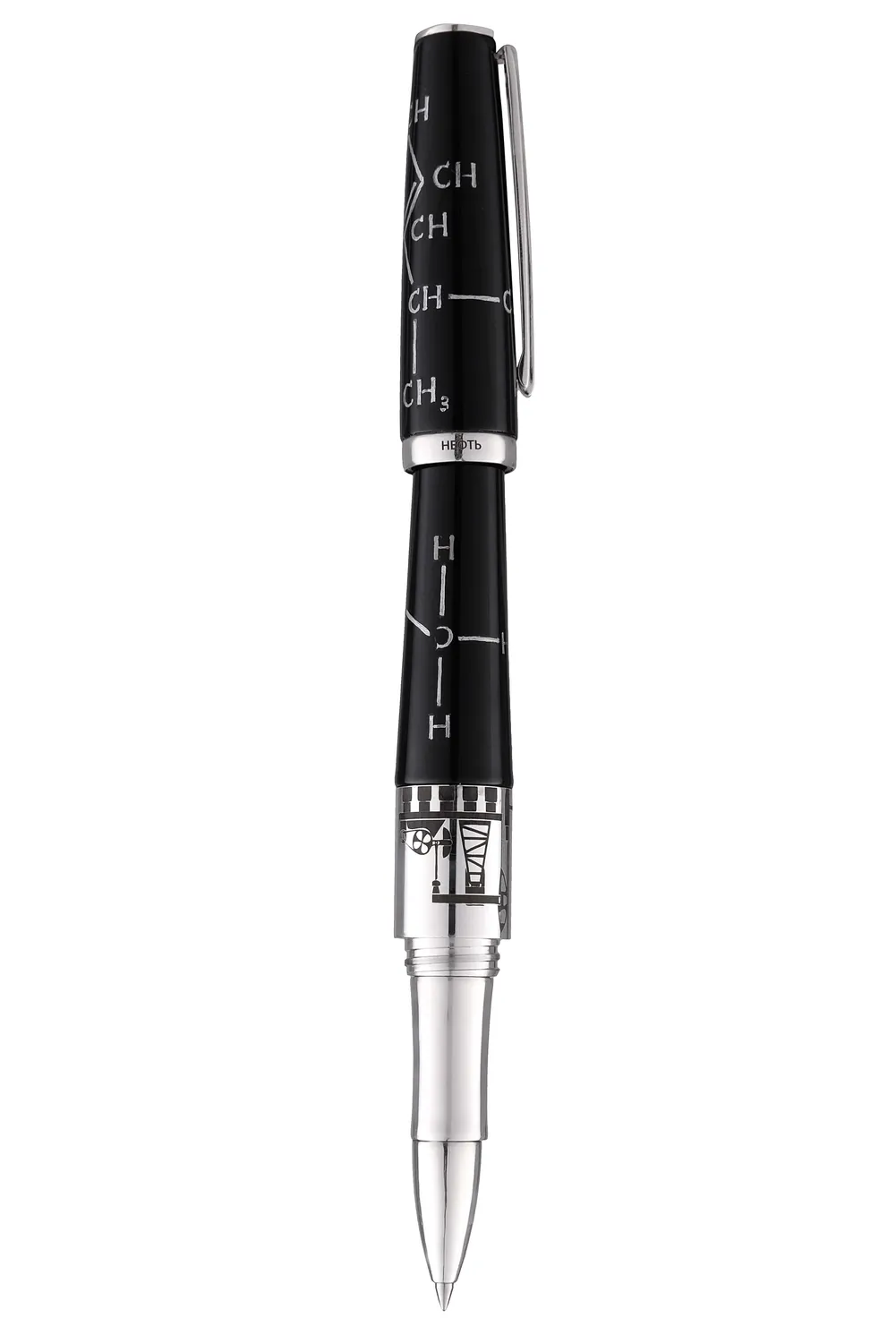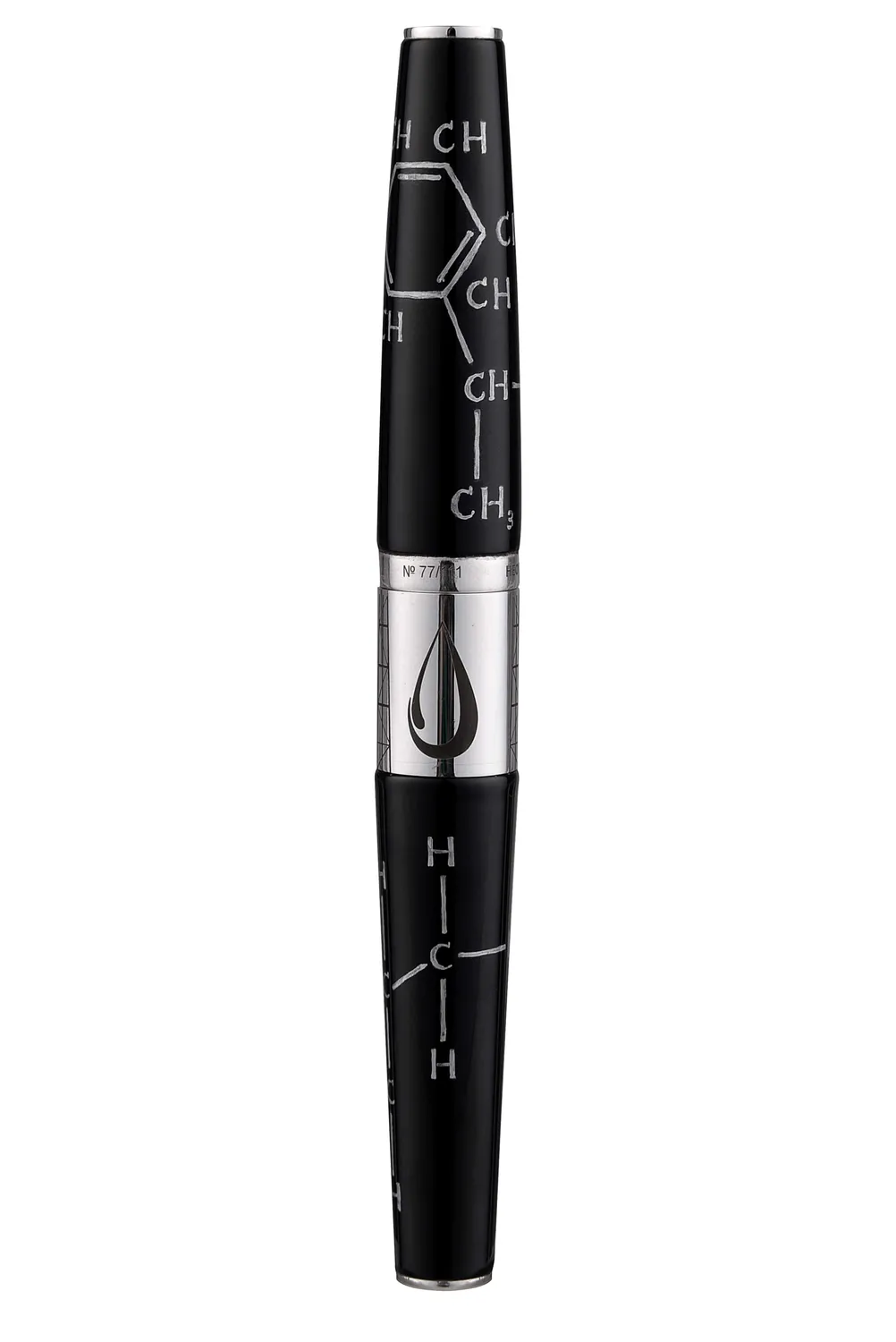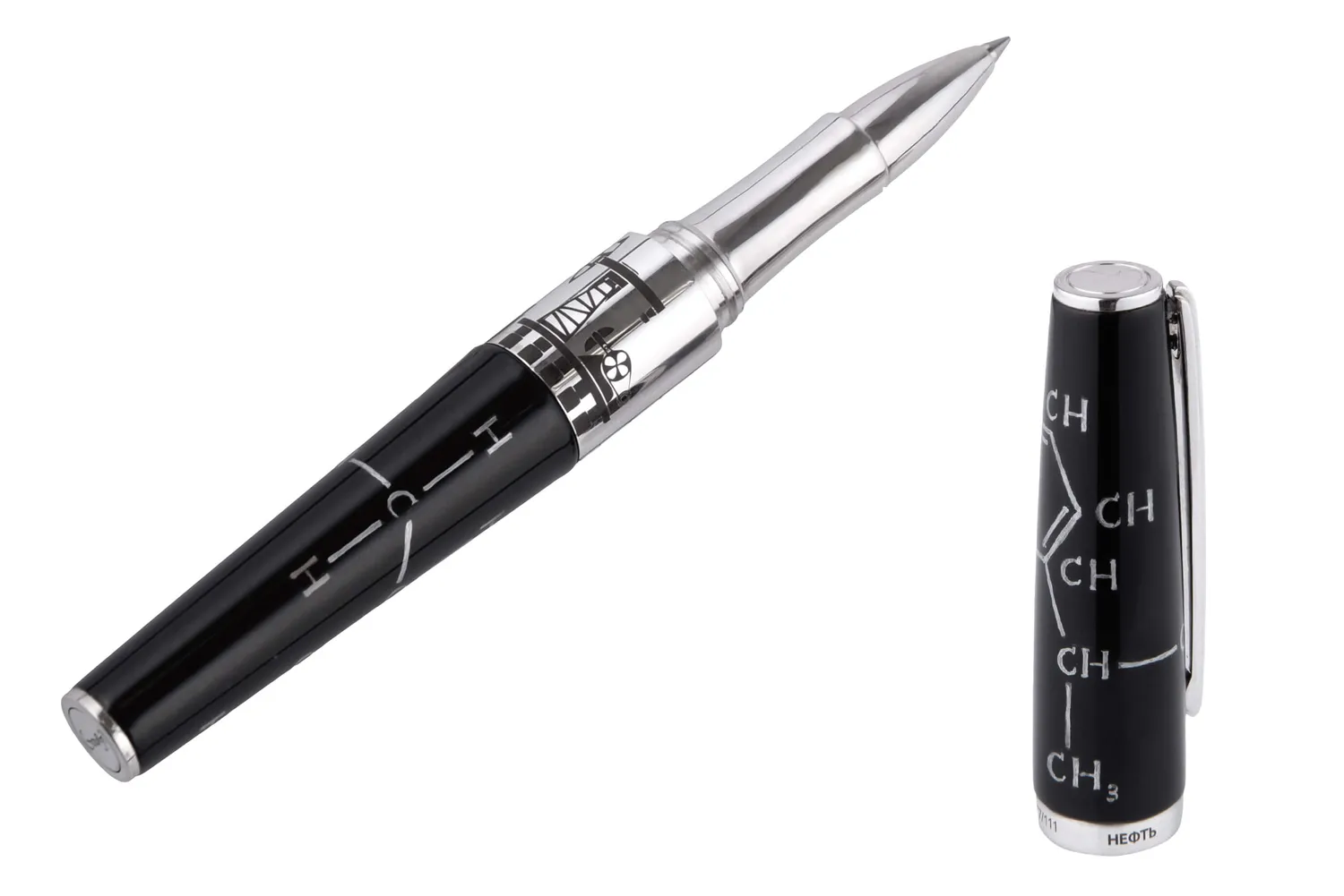 Корпус ручки выполнен из акриловой смолы, а в качества орнамента дизайнеры решили использовать химическую формулу одного из основных компонентов нефти –изопропилбензола, напоминающую своим «размером» нотную запись.