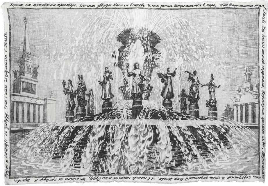 Сам фонтан, изображенный на фоне двух еще советских павильонов ВДНХ, особо живописен благодаря струящимся потокам воды. Примечателен и рукописный текст, окаймляющий центральную композицию шали, поскольку это первые два куплета и припев хорошо знакомой нам «Песни о Москве» из кинофильма 1941 года «Свинарка и пастух».