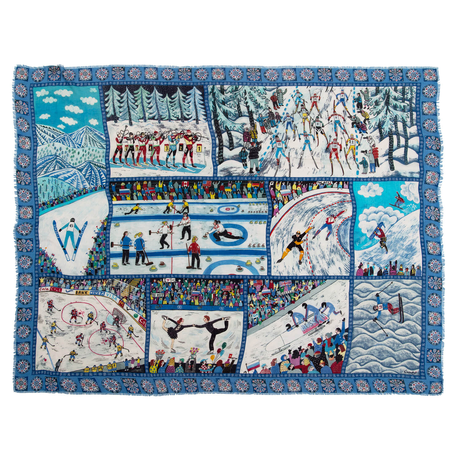 Многоуровневое построение пространства шали вполне естественно, чтобы вписать в него логично с художественной точки зрения десять различных зимних видов спорта (хоккей, биатлон, кёрлинг, фигурное катание и другие).