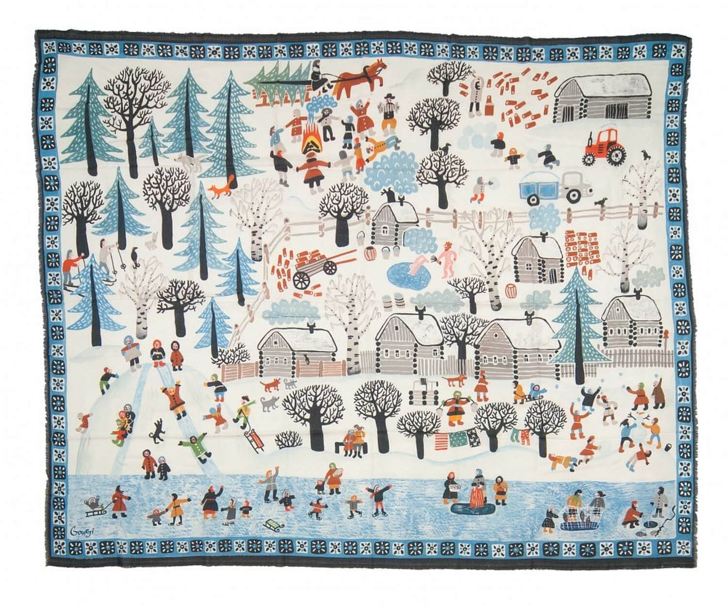 Шаль "Зимняя деревня". Напоминающая традиционный русский набивной платок, шаль «Зимняя деревня», благодаря обдуманно упрощенному рисунку, идеально отражает простоту и естественность зимней деревенской жизни.