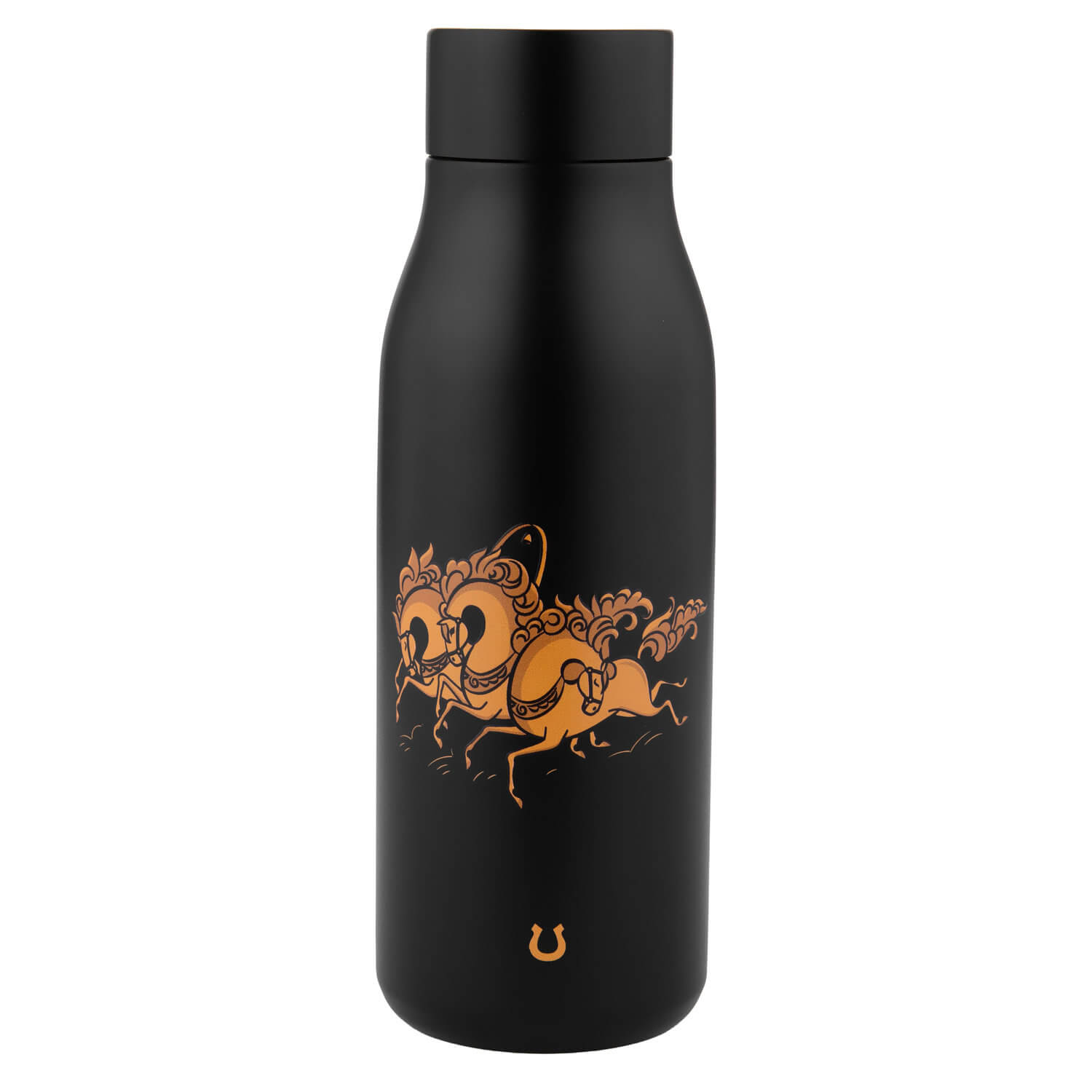 Золотистые лошади в неудержимой скачке изображены на черном фоне на аксессуарах (ежедневник, пауэрбанк и термобутылка) и толстовке из этой коллекции, а алая тройка украшает лаконичную белую чайную пару.