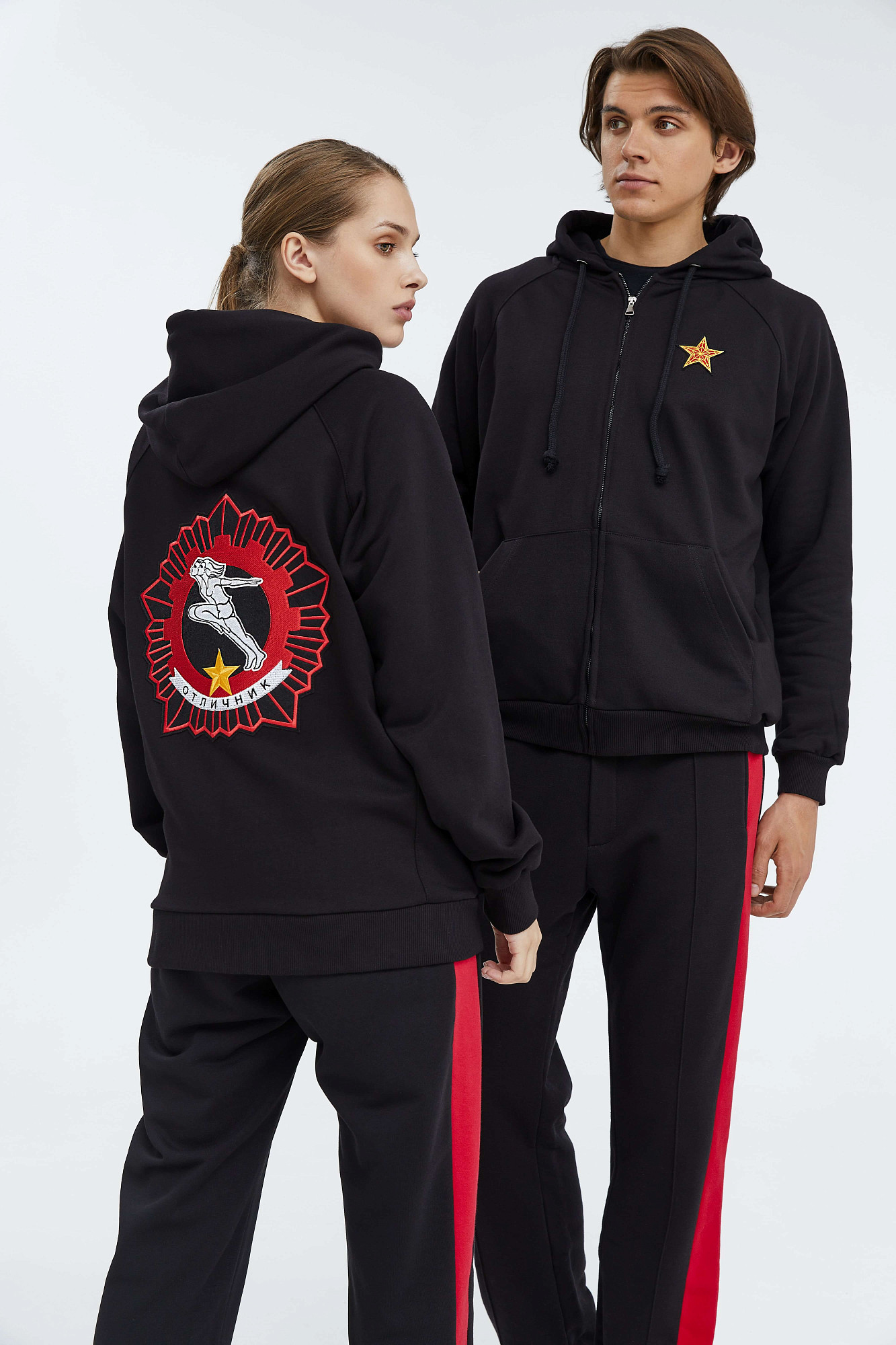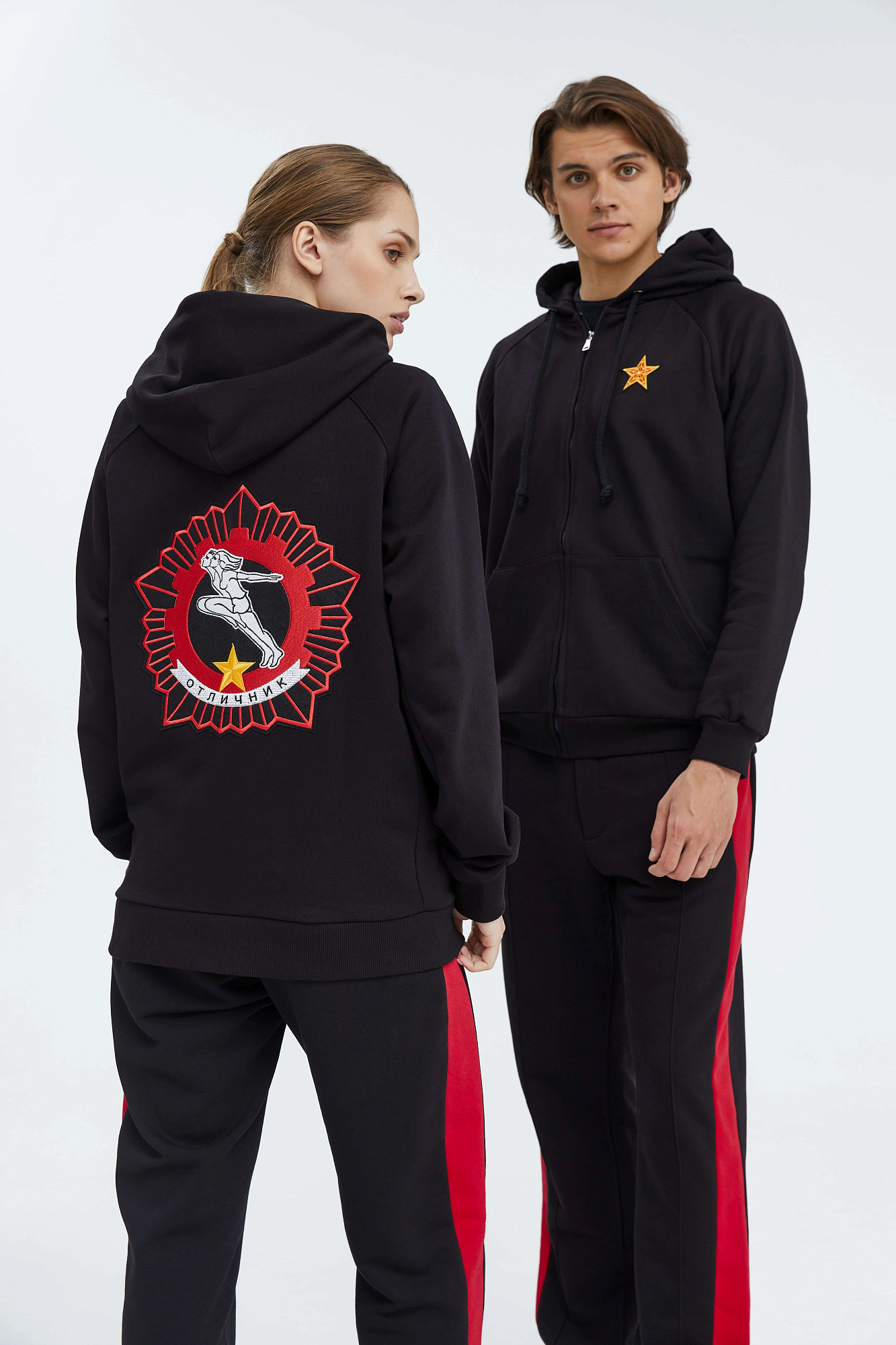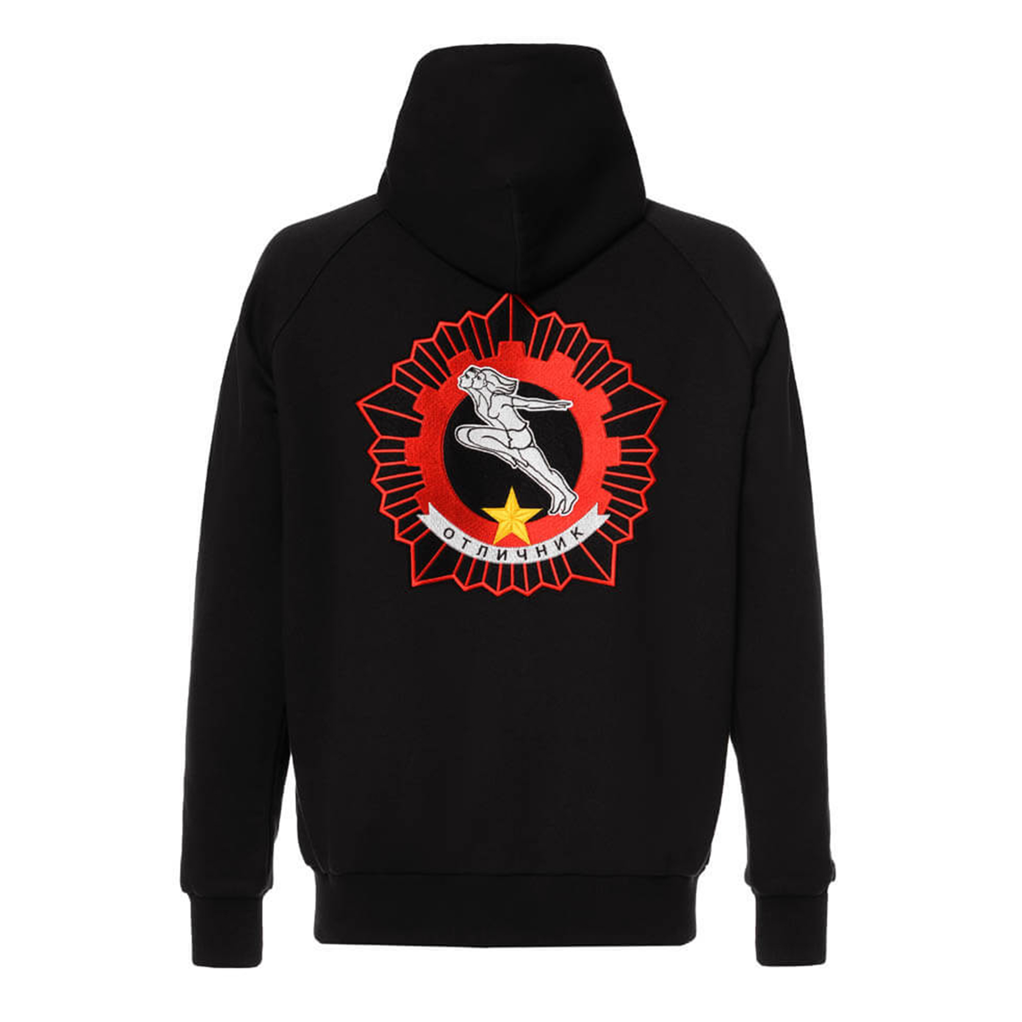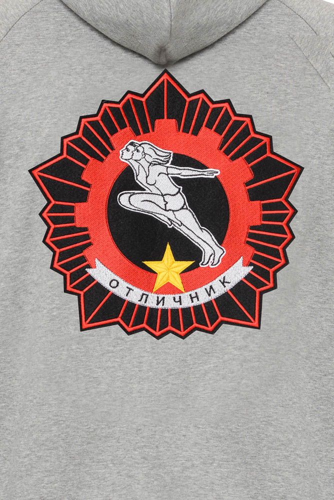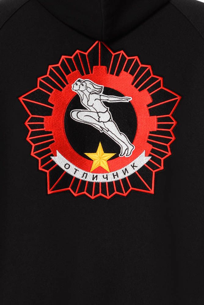 За основу вышивки на спине был взят значок ГТО 1972 года: бегущая пара — девушка и юноша — на фоне пятиконечной звезды и вписанной в неё шестерёнки.