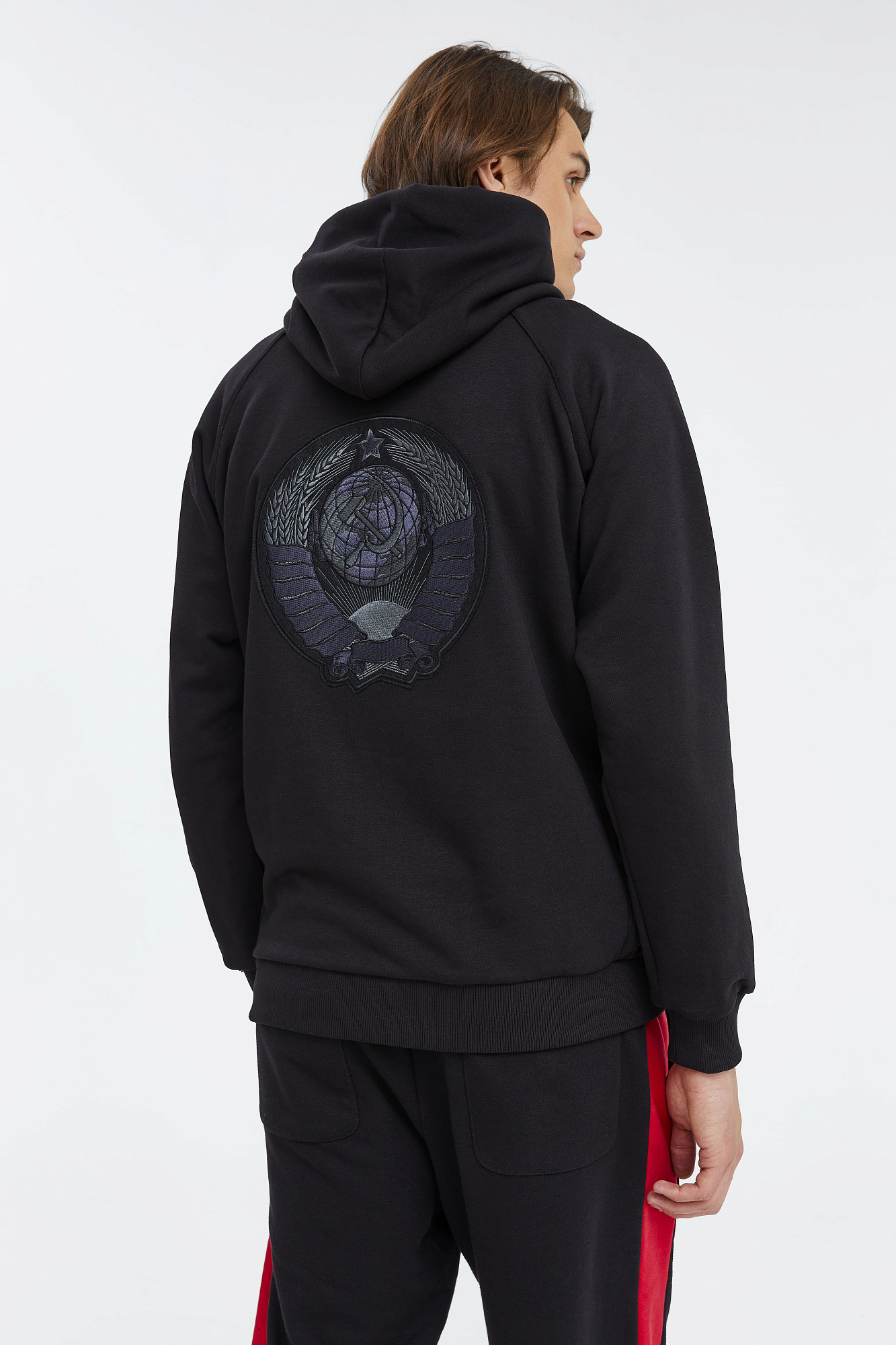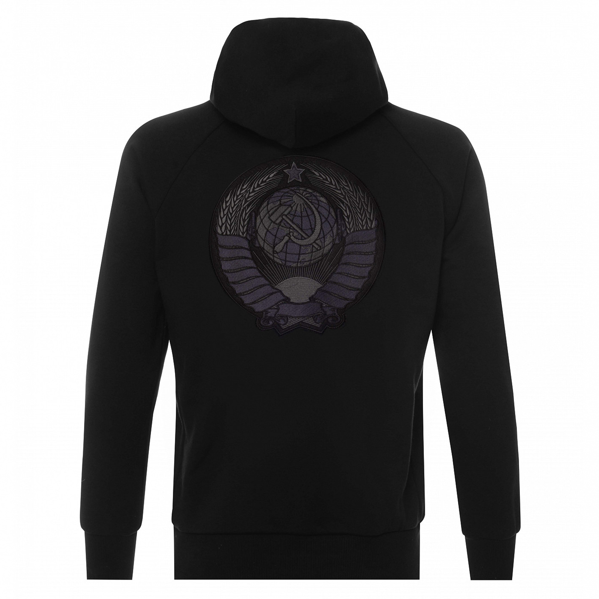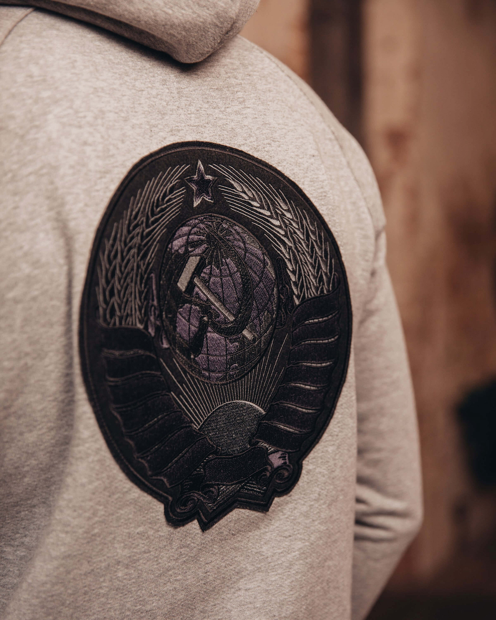 Толстовка с капюшоном на кулиске. Рукав реглан. Рельефная трикотажная резинка по низу рукавов и нижнему краю. Прорезные боковые карманы. Герб союза: Своего рода пару толстовке с гербом России составляет толстовка с гербом СССР. На её спинке вышит поздний вариант символики, принятый в 1956 году. Тогда Карело-Финская ССР была преобразована в автономию РСФСР, поэтому лент на колосьях осталось 15 — по числу союзных республик.