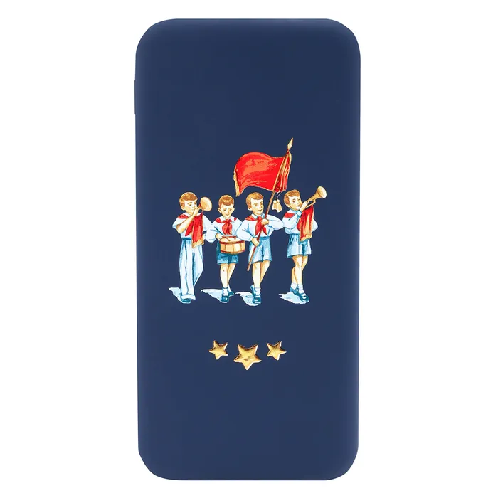 Новинка 2022 года бренда Gourji - внешний аккумулятор "Пионеры" с классическим изображением ребят в обрамлении звезд.