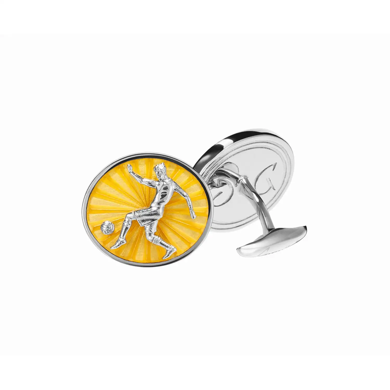 Запонки, серебро 925 пробы, с эмалью. Одна из самых динамичных и красивых барельефных фигур на станции метро «Динамо» – футболист с мячом. Столь эффектный барельеф был посвящен футболистам вполне обоснованно: к середине 1930-х годов в СССР самым популярным и самым массовым видом спорта становится футбол.