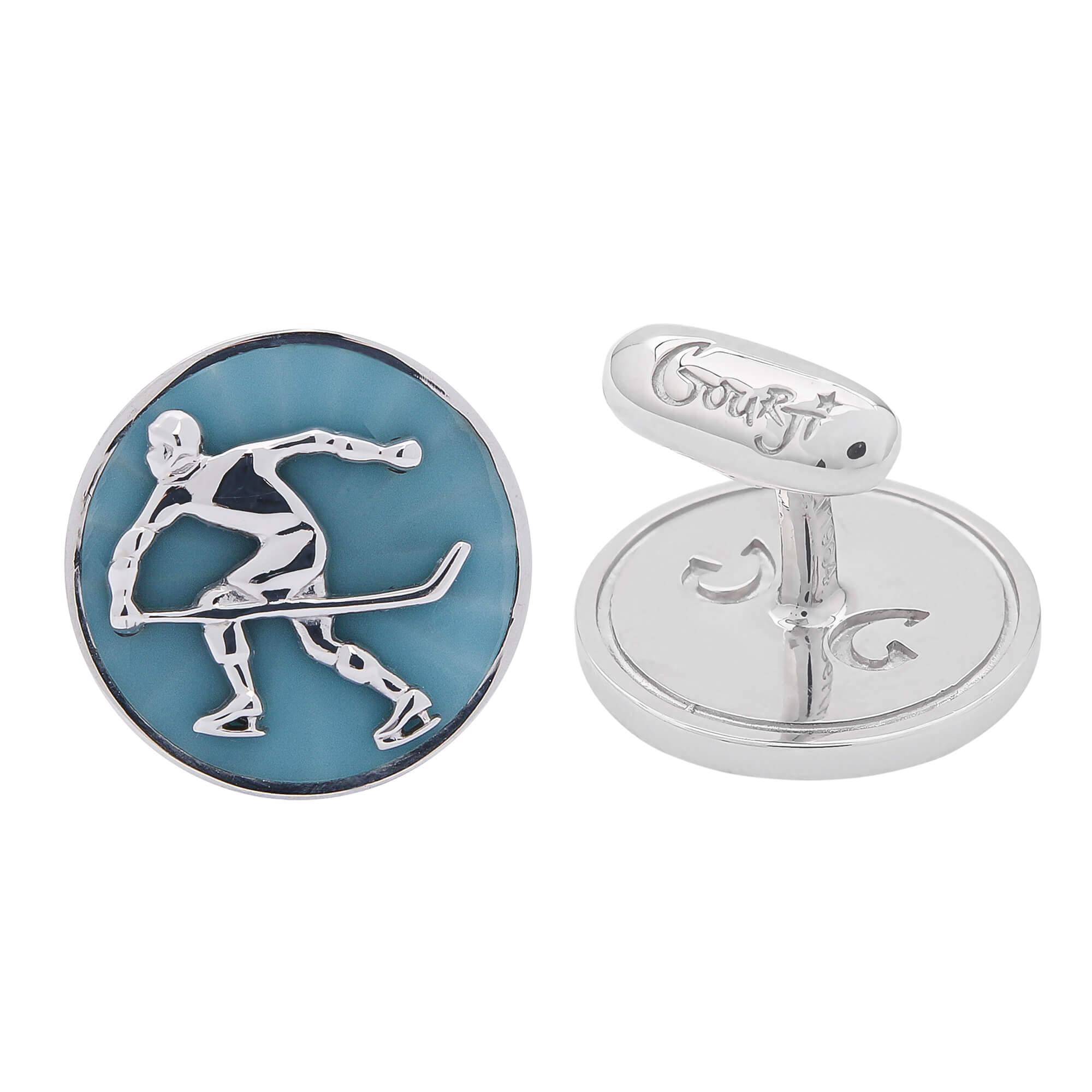 Миниатюрный барельеф, украшающий запонку, идеально отражает динамику игры в хоккей, что и хотел продемонстрировать скульптор.