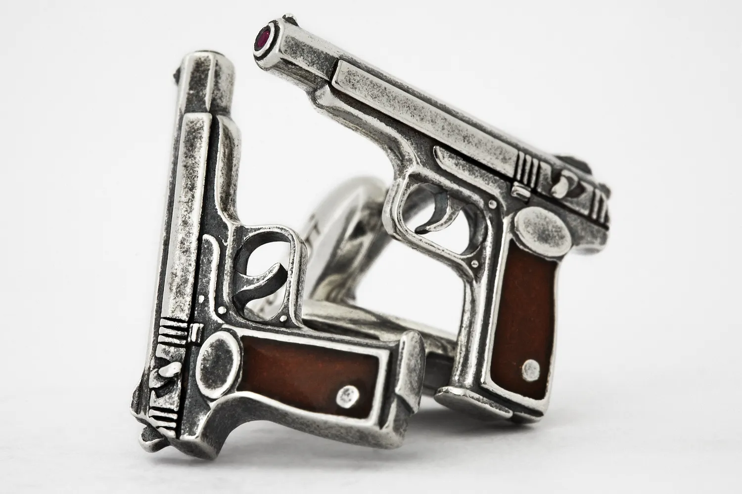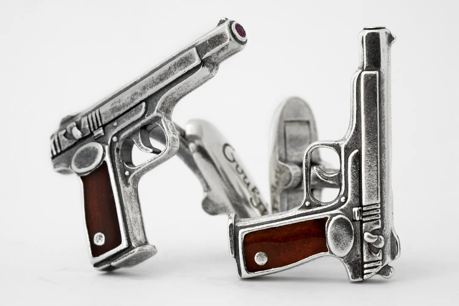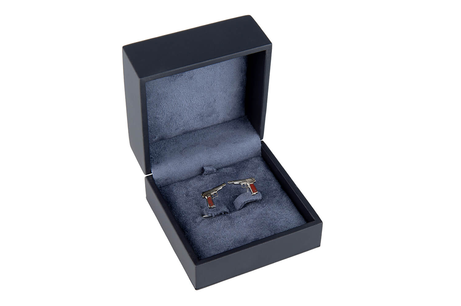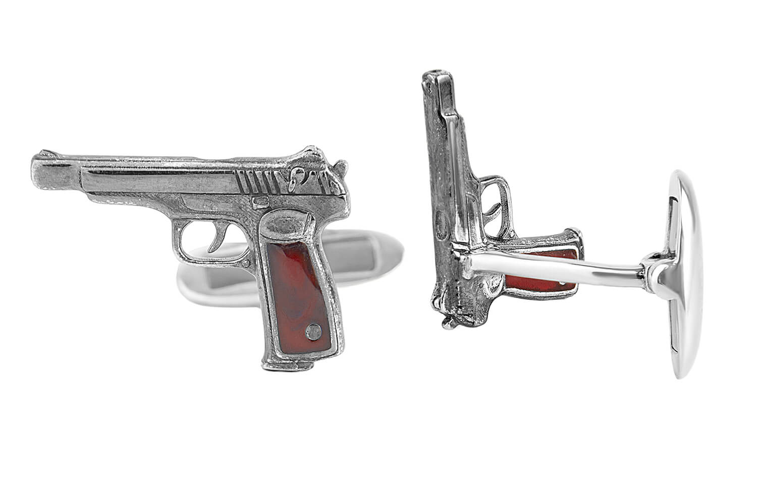 Эти запонки являются миниатюрной копией 9-миллиметрового автоматического пистолета, разработанного на рубеже 1940-х–1950-х годов конструктором стрелкового оружия И. Стечкиным. Автоматический пистолет Стечкина (АПС) был принят на вооружение Советской Армии в 1951 году. АПС стал личным оружием офицеров и солдат боевых спецподразделений МВД, ФСБ (КГБ), где он используется и по сей день.