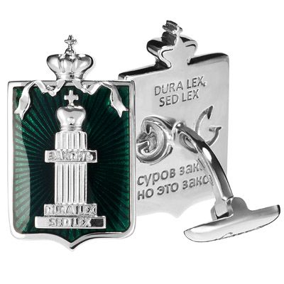 На тыльной части выгравированы фразы «Суров закон. но это закон» на латыни и русском языке. а ножки запонок украшены гравировкой Gourji. За основу взята эмблема и девиз правоохранительных органов с 1801 года. Серебро высокой пробы отполировано до зеркального блеска и прекрасно сочетается с эмалью. Компания Gourji уделяет большое внимание качеству изделий. каждый аксессуар. выпущенный под этой маркой. отражает определенный пласт русской истории и культуры. В создании аксессуаров и предметов роскоши принимают участие лучшие европейские художники. ювелиры и дизайнеры.