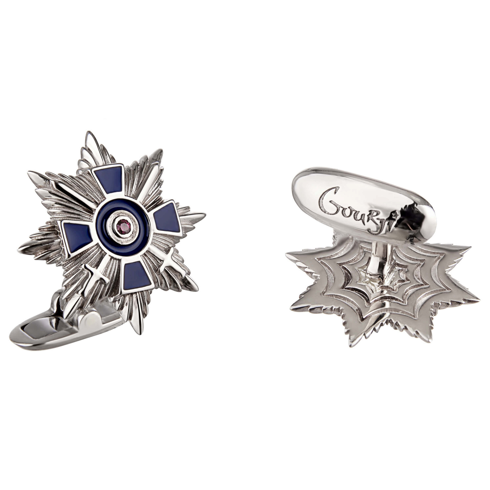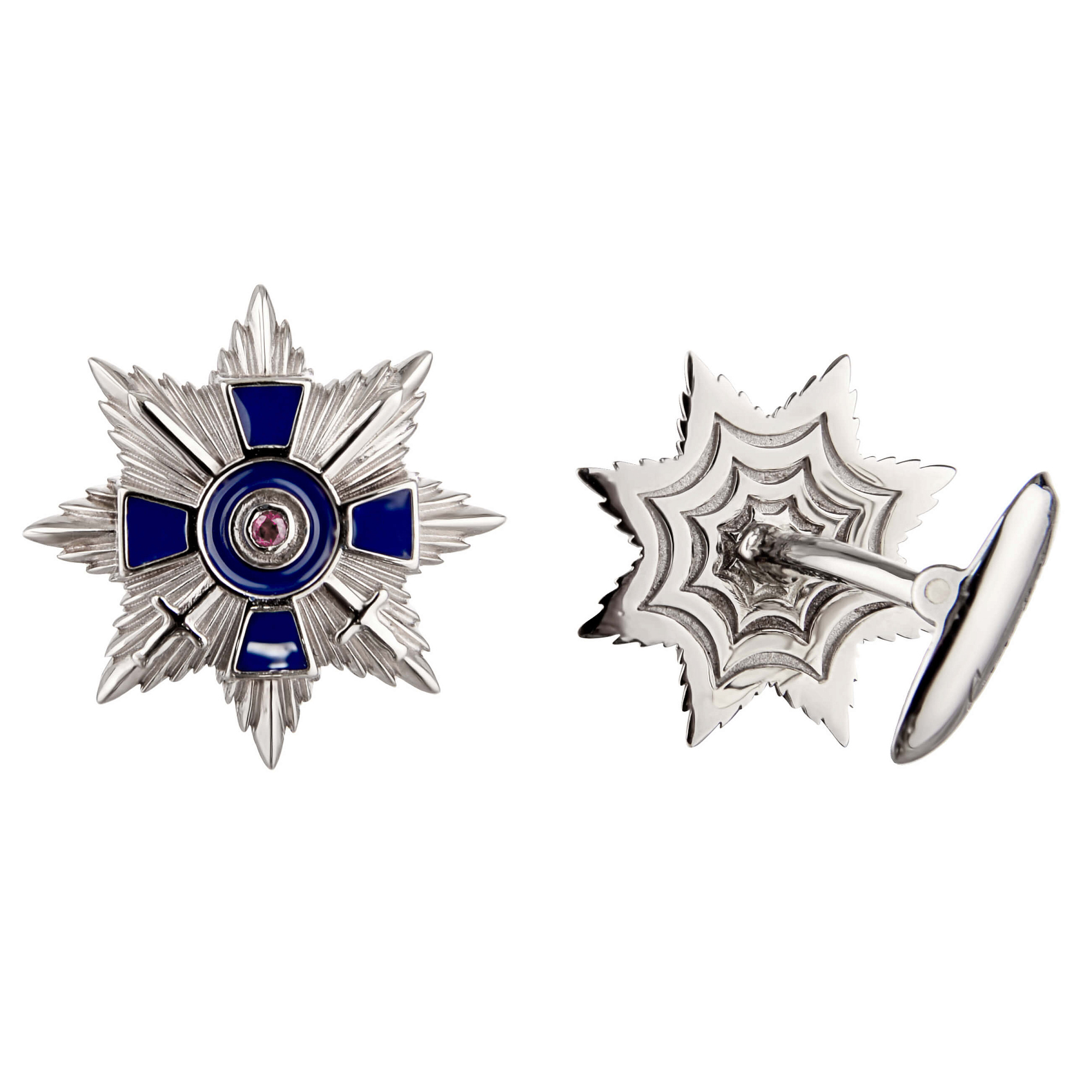 Запонки изготовлены из серебра 925 пробы с эмалью и рубиновыми вставками.
